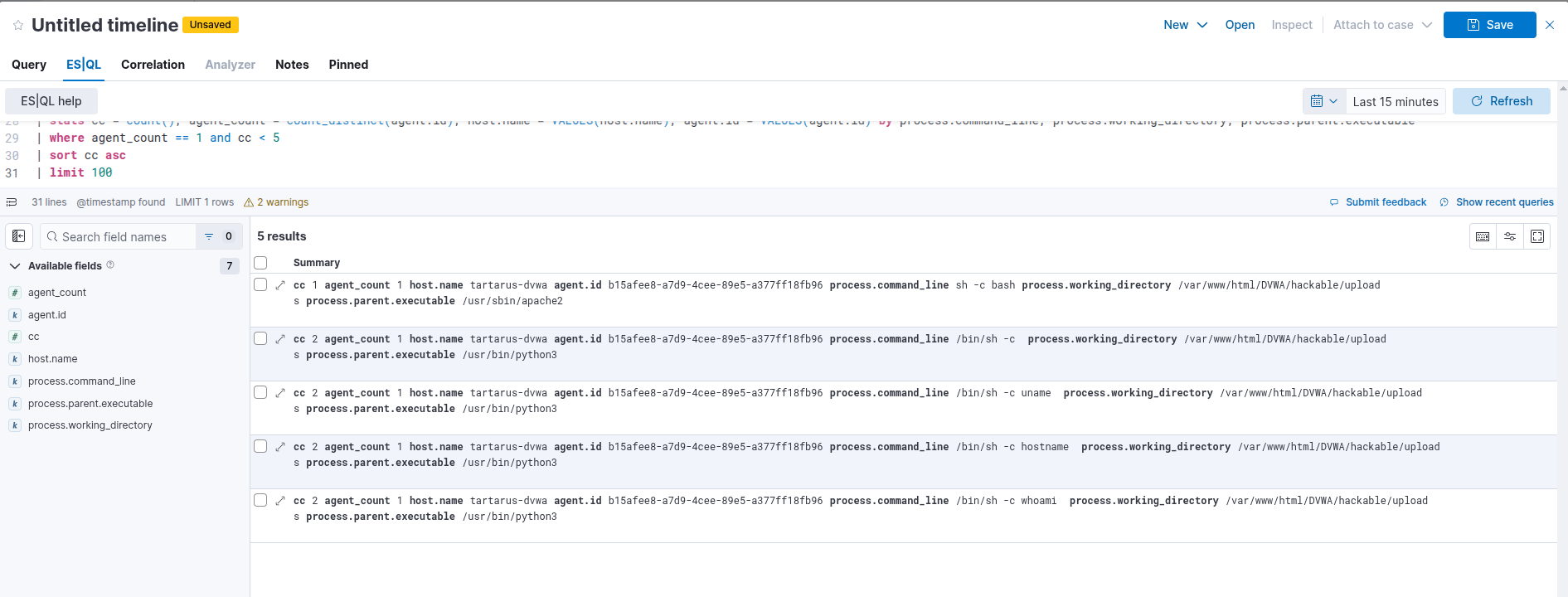 The issue now is Unusual Process Spawned from Web Server Parent & Unusual Command Execution from Web Server Parent fortunately for us this rule only runs every hour and will pick up some activity but not all!