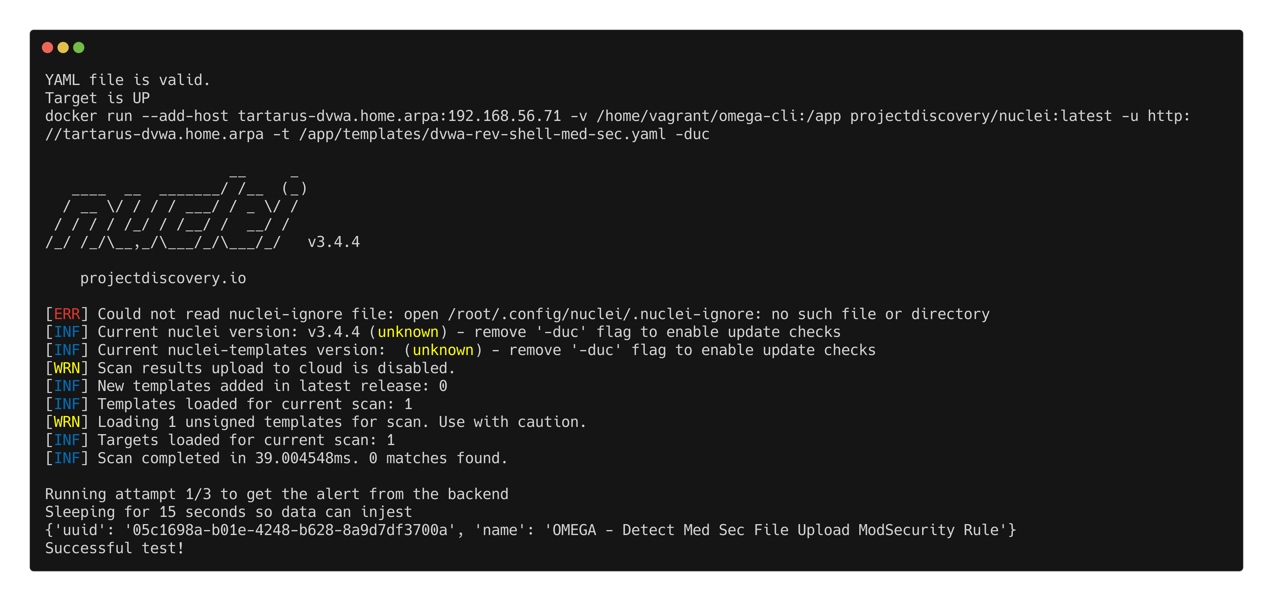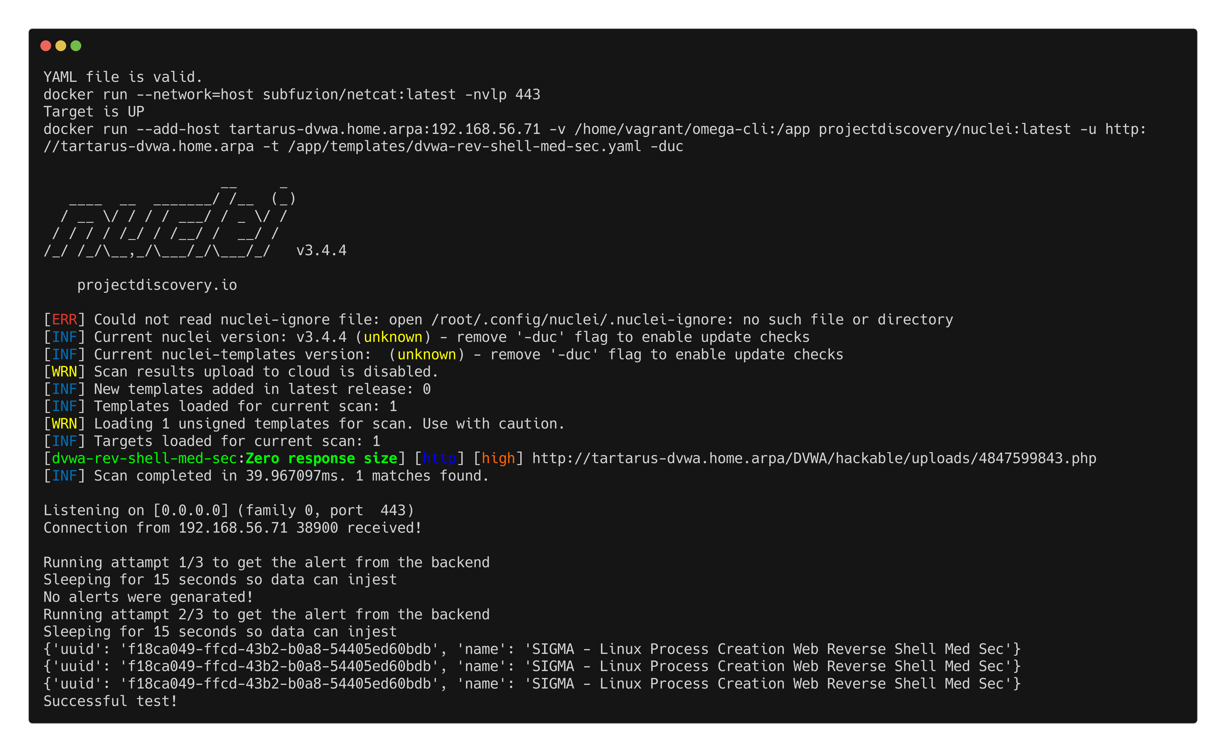 python3 omega.py --config tests/nc_nuclei_apache_rev_shell_med_sec_modsec.yml elastic-local -t http://tartarus-dvwa.home.arpa -d