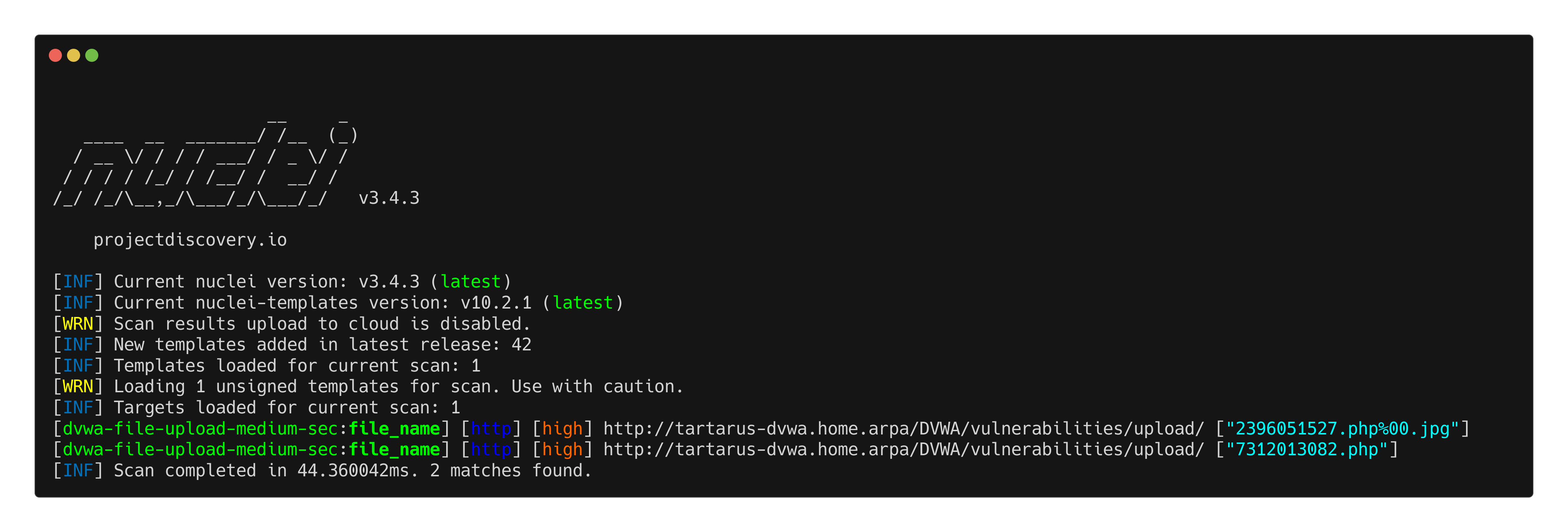 nuclei -u http://tartarus-dvwa.home.arpa/DVWA -t /vagrant/nuclei-templates/dvwa/dvwa-file-upload-medium-sec.yaml