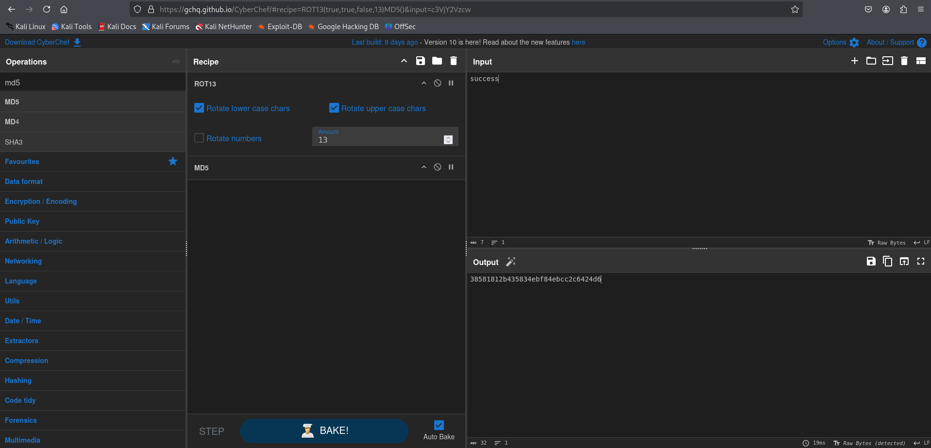 We take the value ‘success’ do a ROT13 on it and then MD5 hash the result. For this next step you could do it in burp or the like, I’ll demo it in the browser.