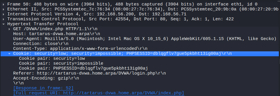 There is an example template to authenticate to the DVWA on GitHub, however it’s not quite right. The template manipulates the session cookie on the fly, leading to multiple cookies with different values in each request. Meaning we must hope they are received and understood in the correct order by the server.