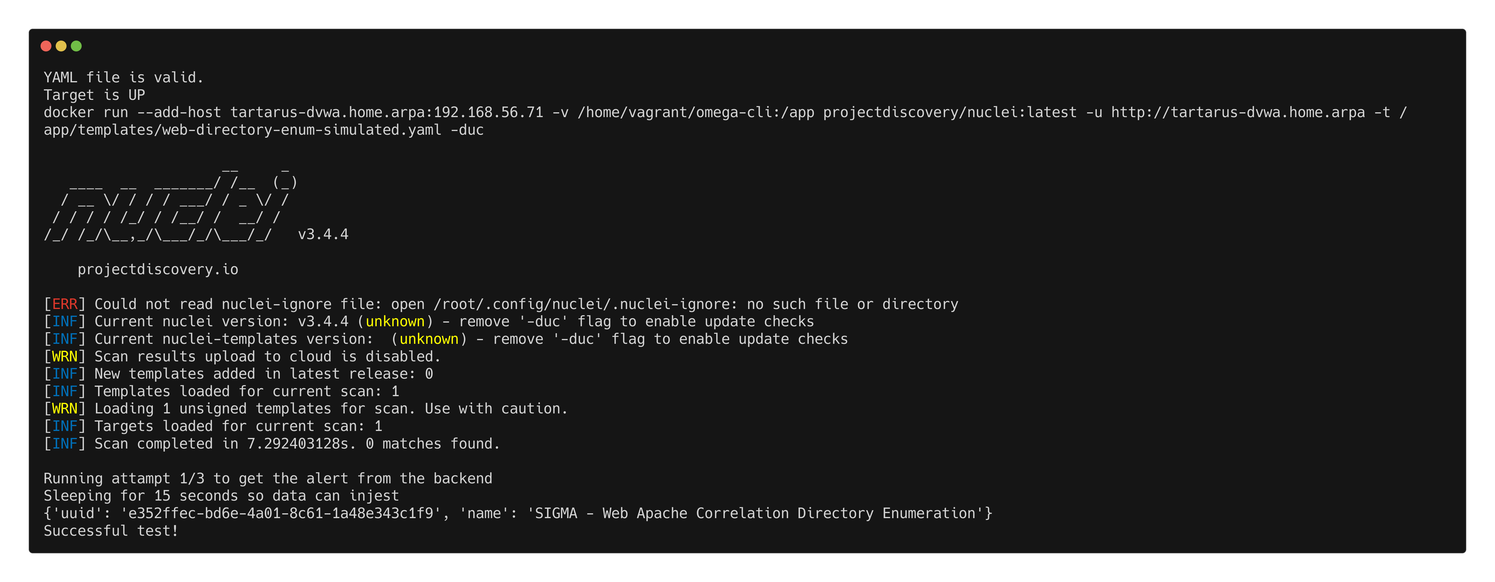 python3 omega.py --config tests/nuclei_apache_dir_enum.yml elastic-local -t http://tartarus-dvwa.home.arpa -d