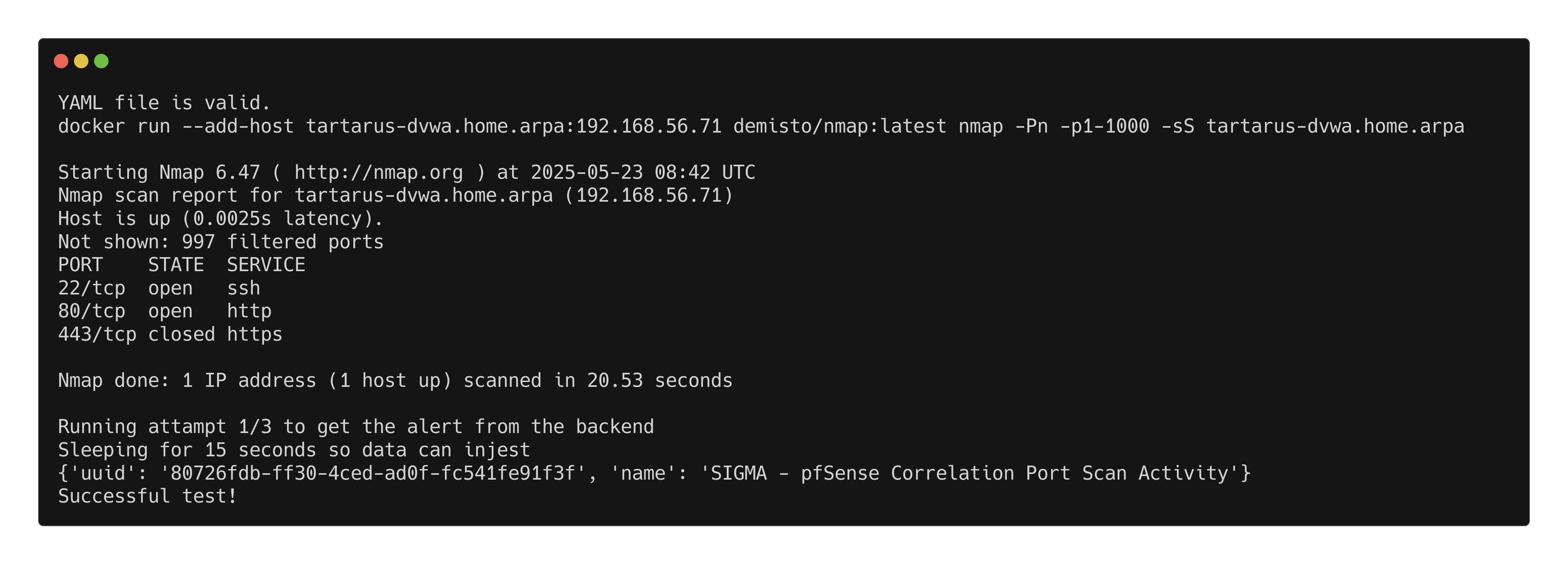 python3 omega.py --config tests/nmap_port1-1000_tcp_syn_scan.yml elastic-local -t http://tartarus-dvwa.home.arpa -d