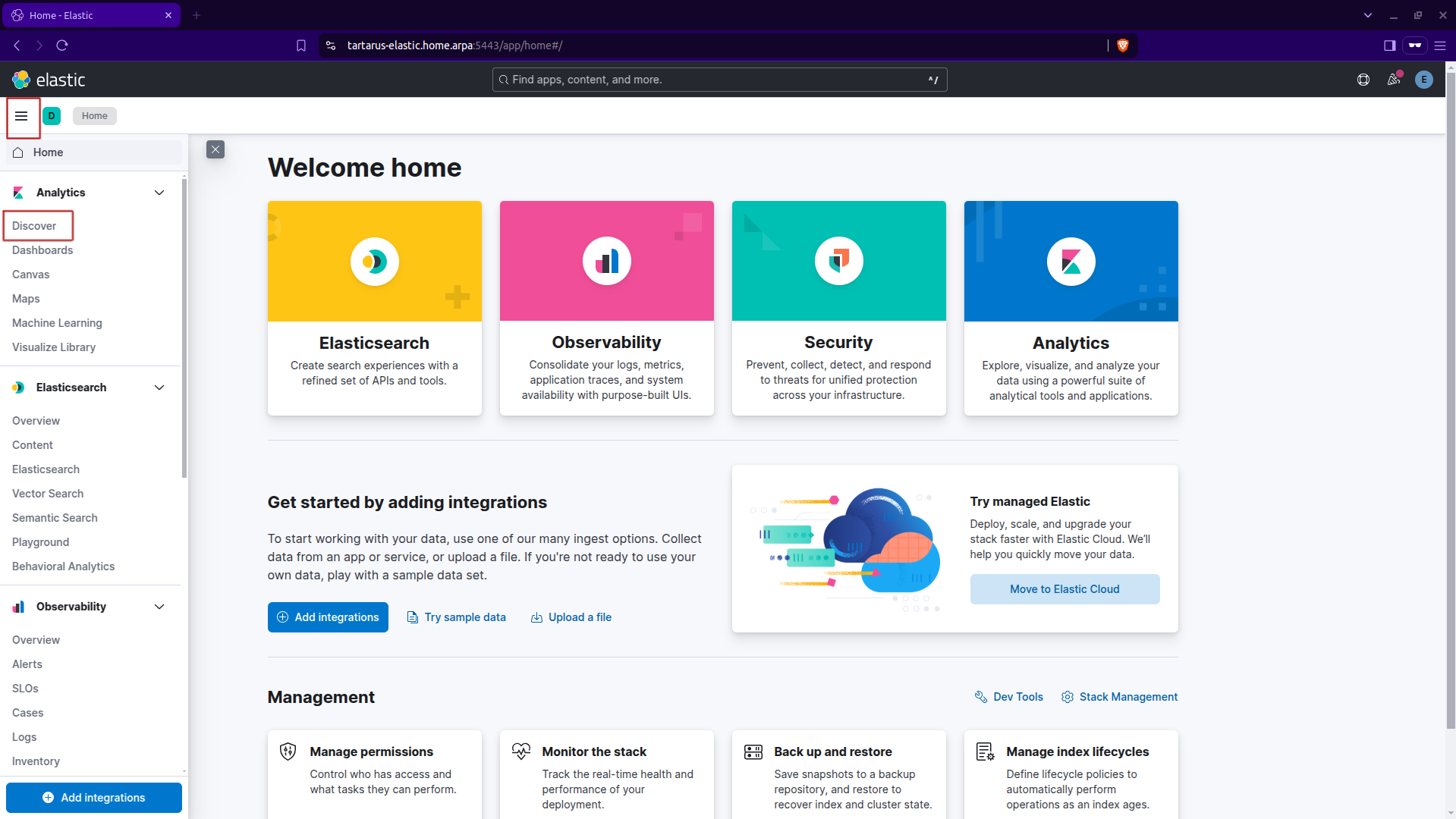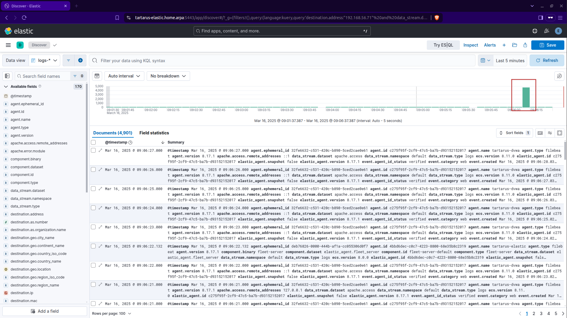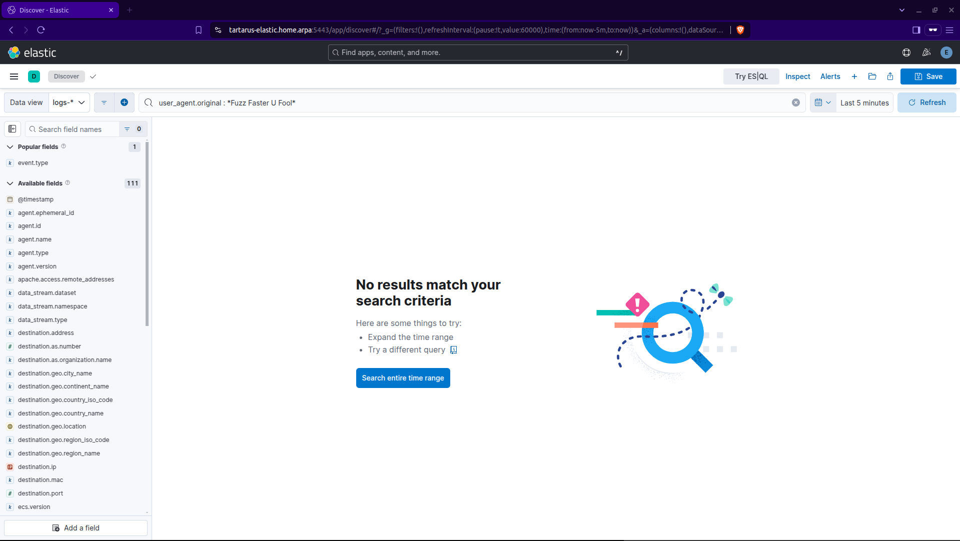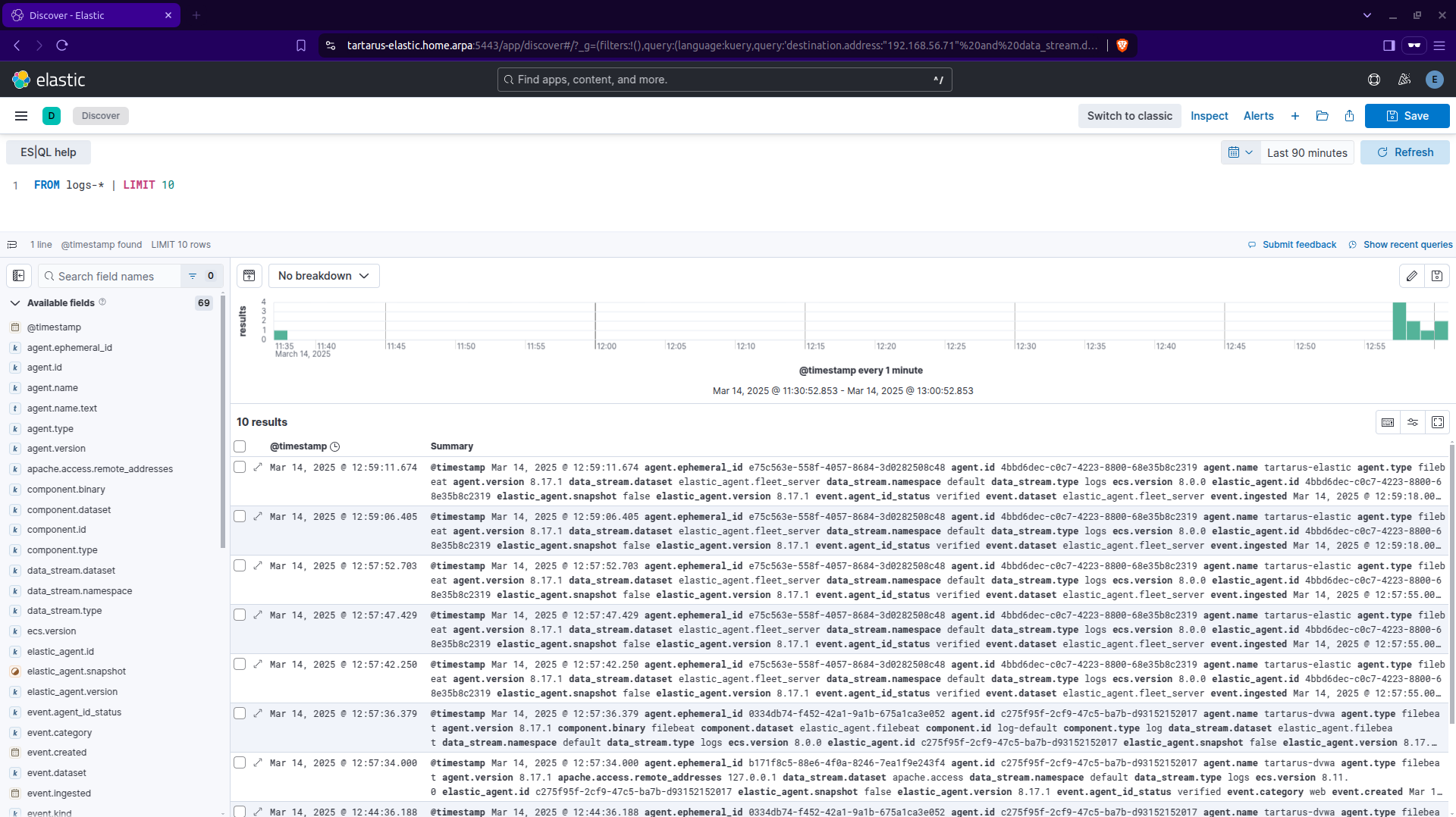 In the Kibana browser go to the Discover tab to view what’s happened. https://tartarus-elastic.home.arpa:5443/app/discover#/