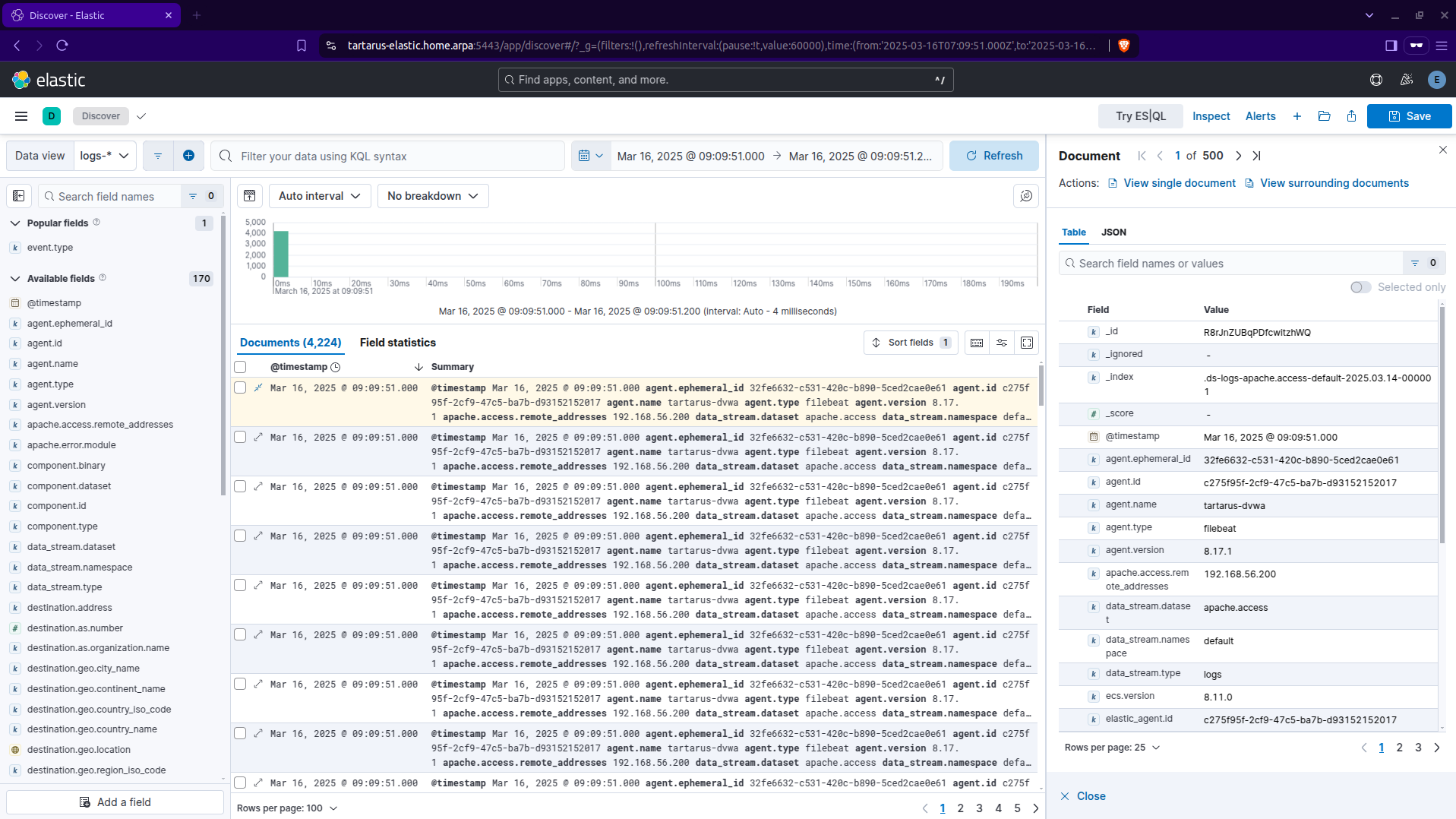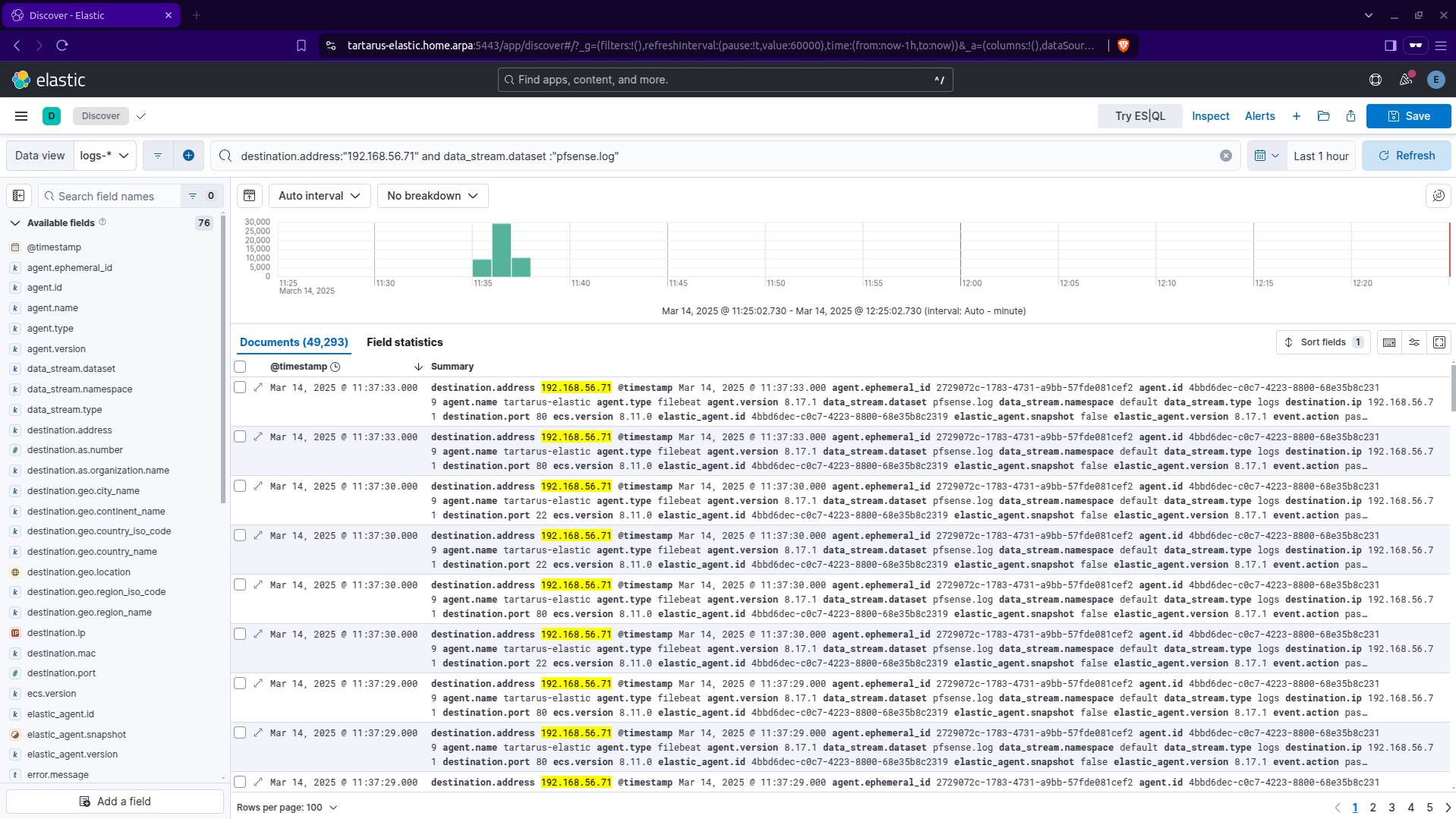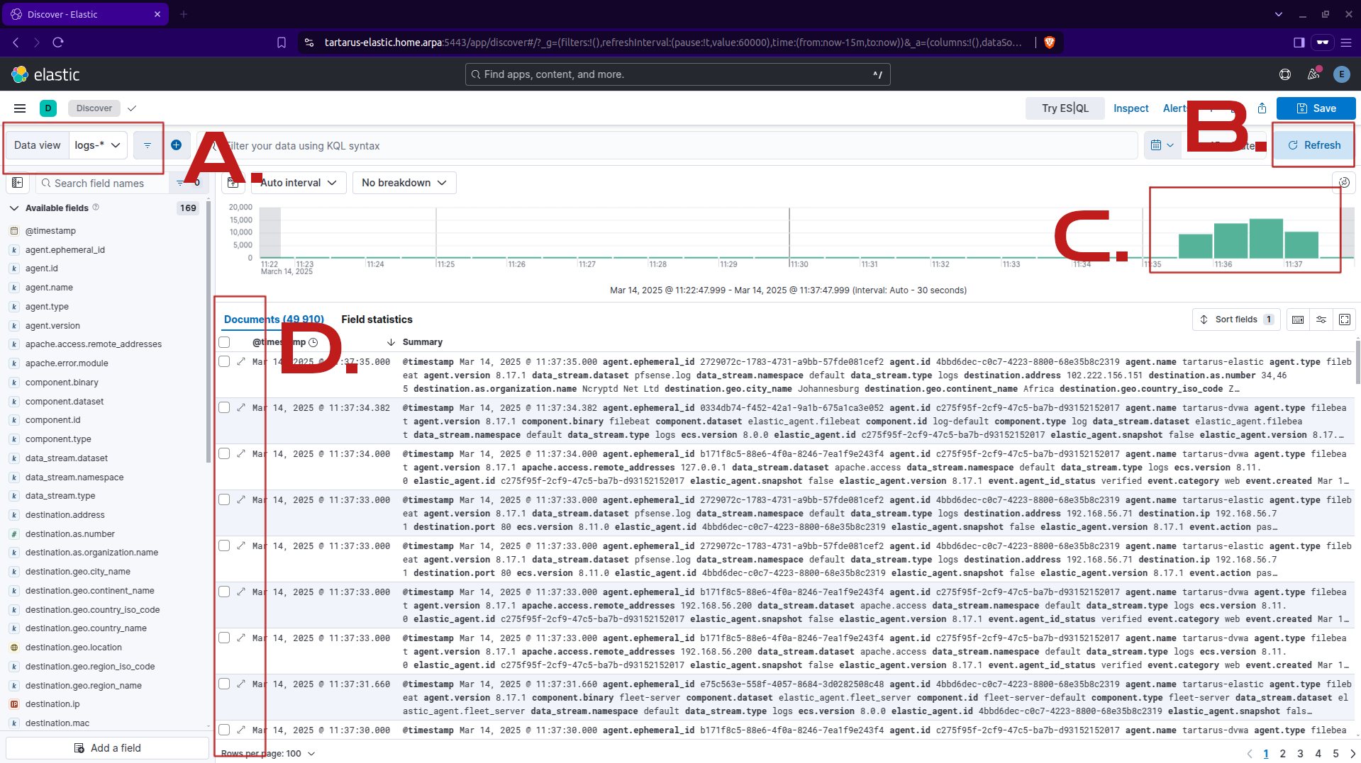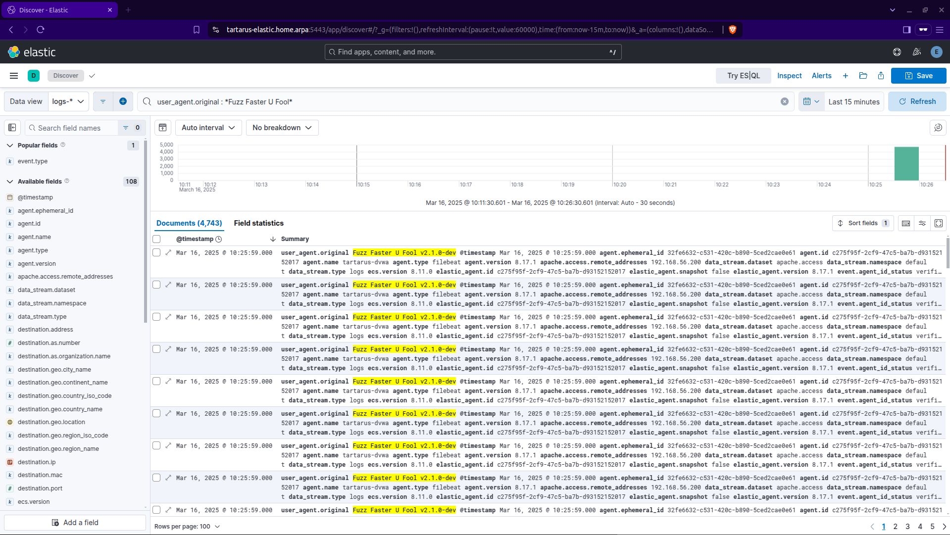 In the Kibana browser go to the Discover tab to view what’s happened. https://tartarus-elastic.home.arpa:5443/app/discover#/