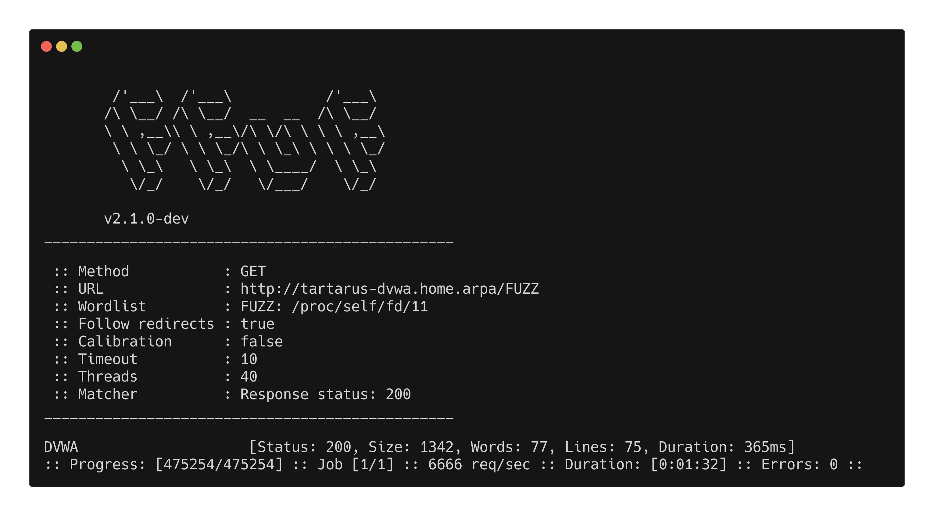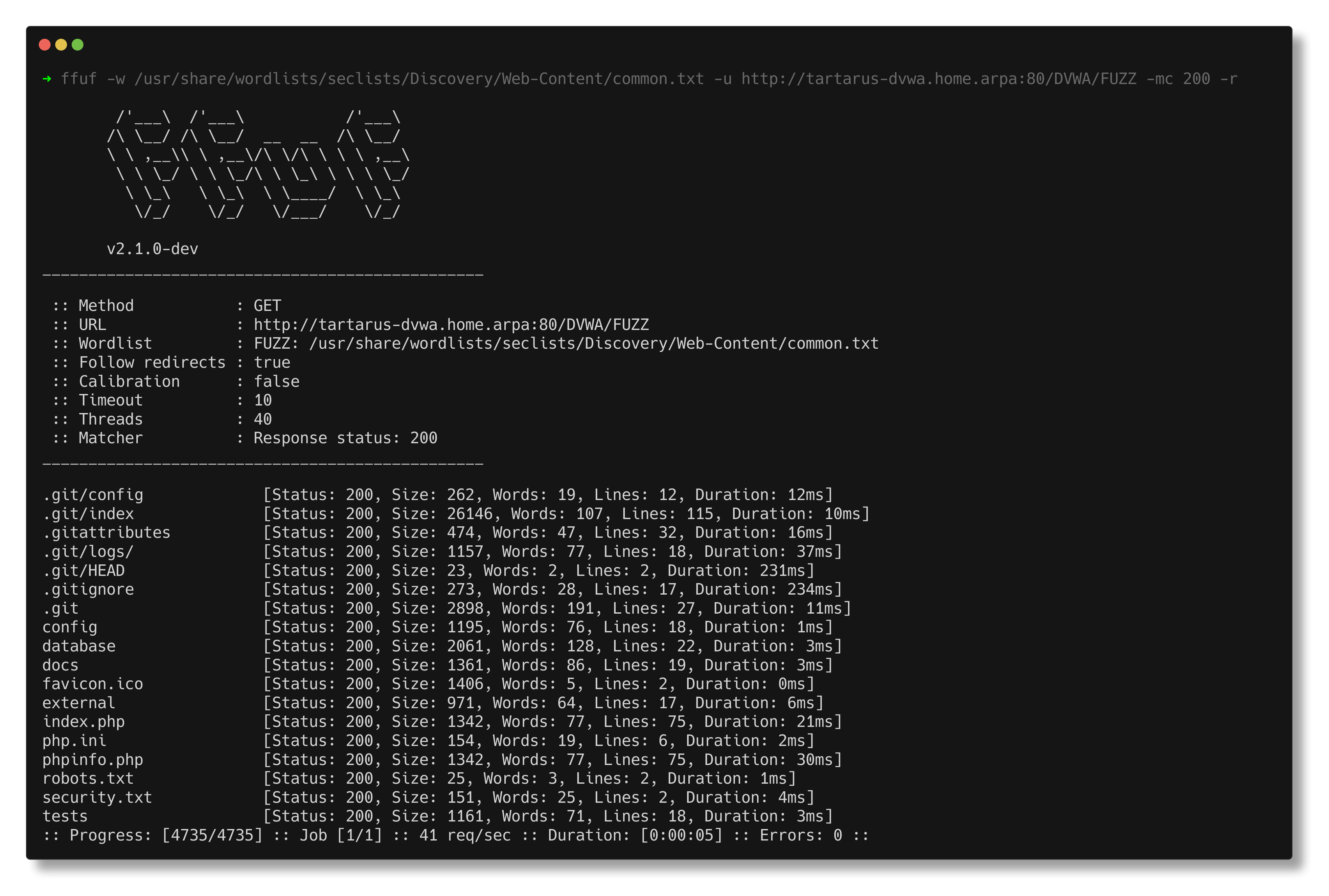 ffuf -w /usr/share/wordlists/seclists/Discovery/Web-Content/common.txt -u http://tartarus-dvwa.home.arpa:80/DVWA/FUZZ -mc 200 -r