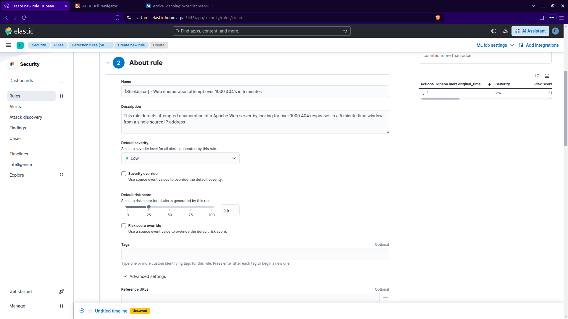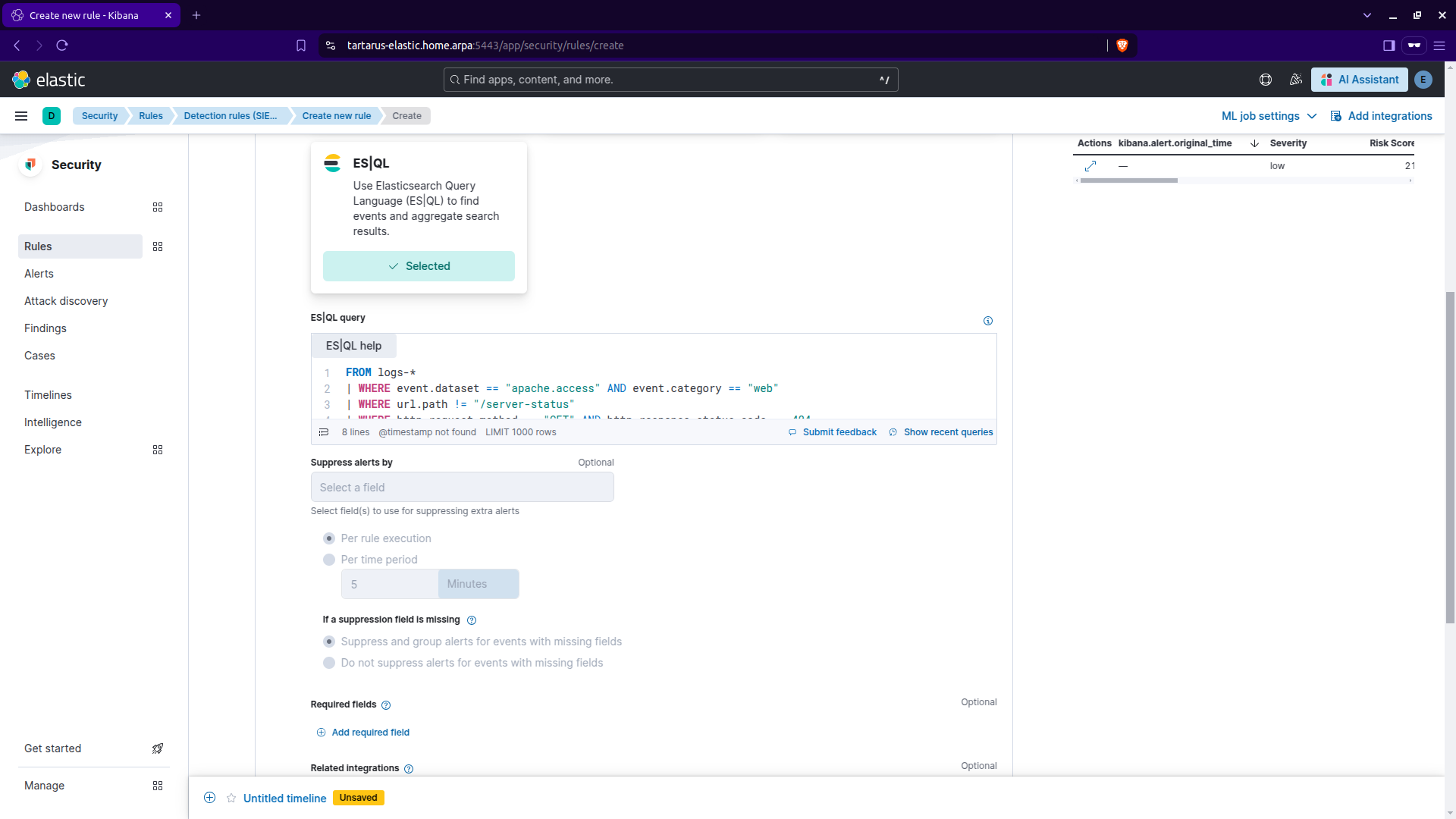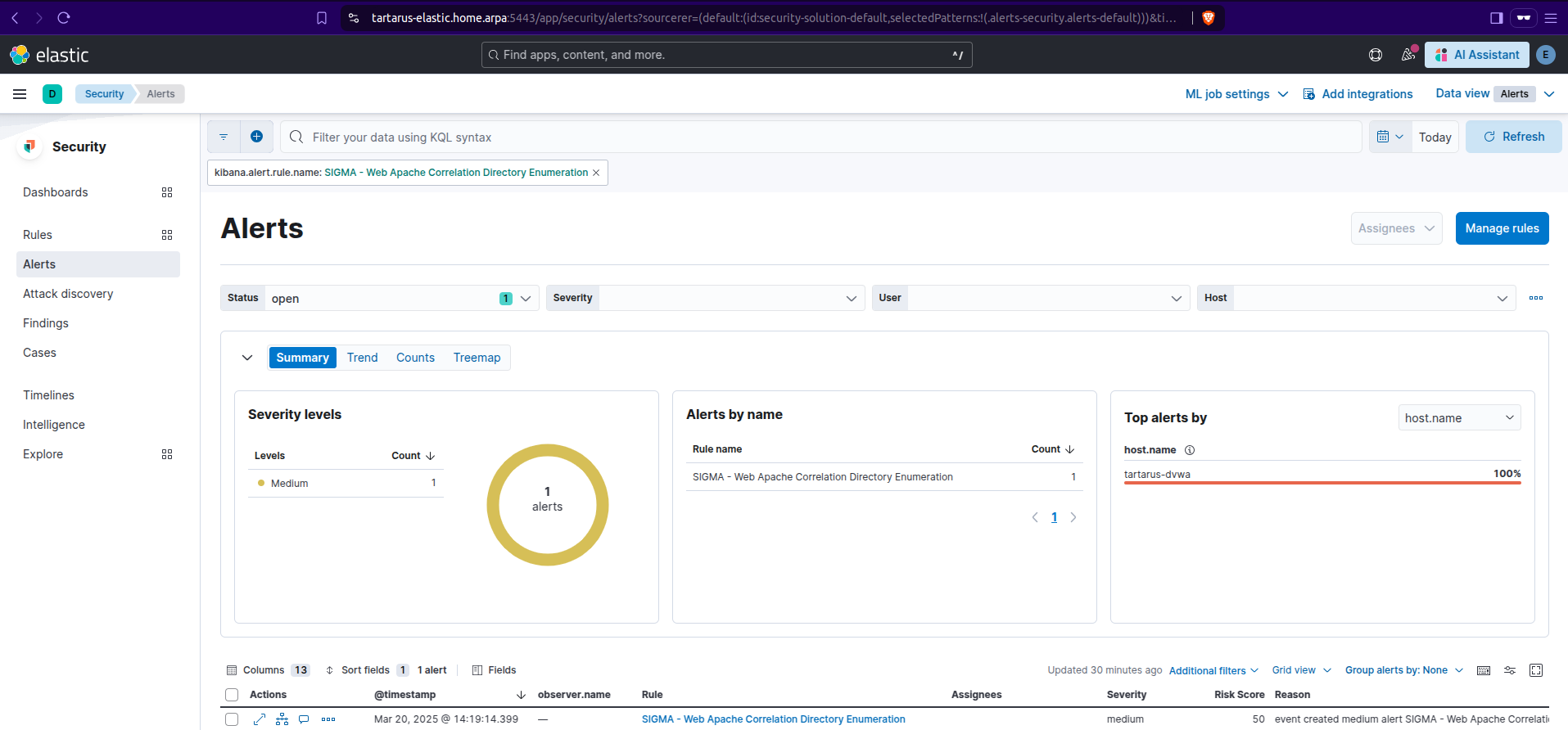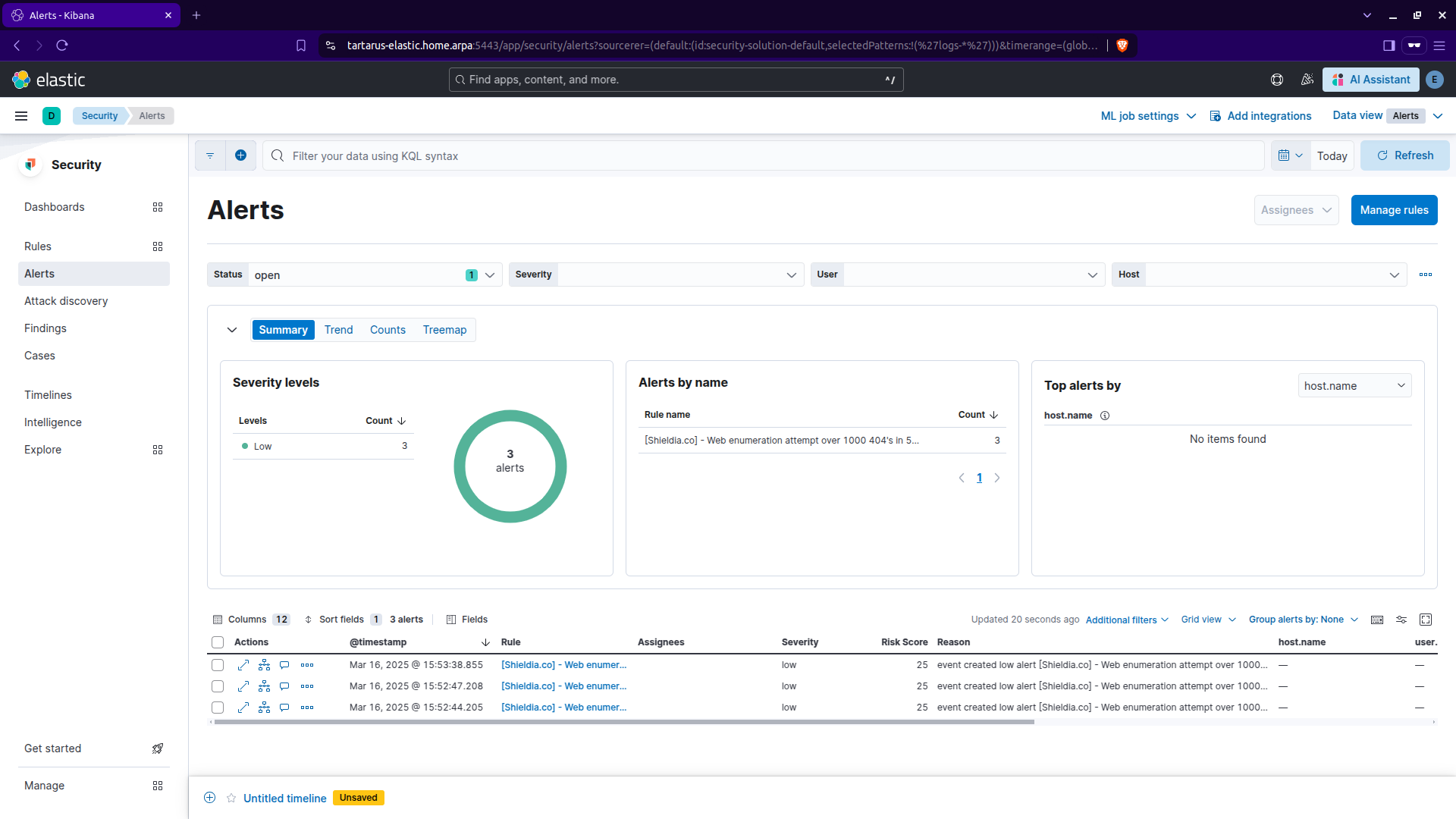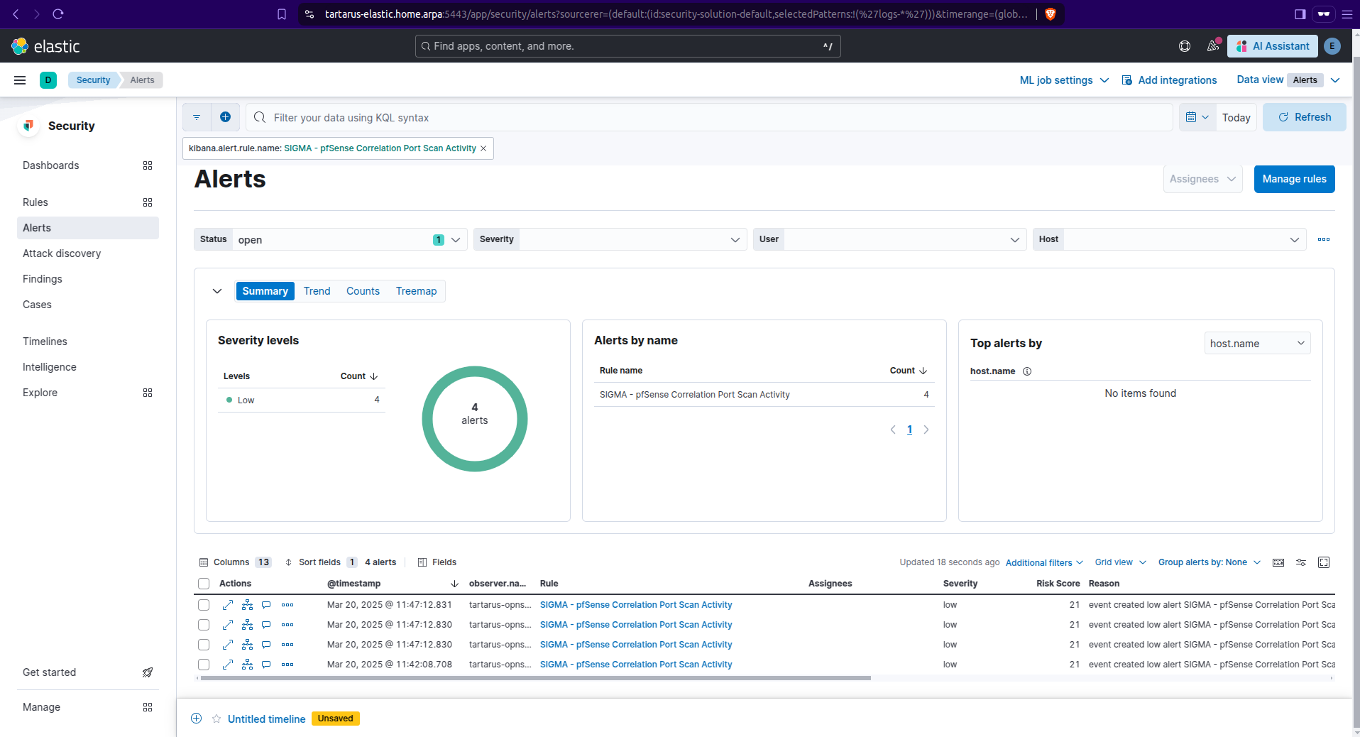 And wait for alerts to flow in, navigate to the ‘Alerts’ tab https://tartarus-elastic.home.arpa:5443/app/security/alerts