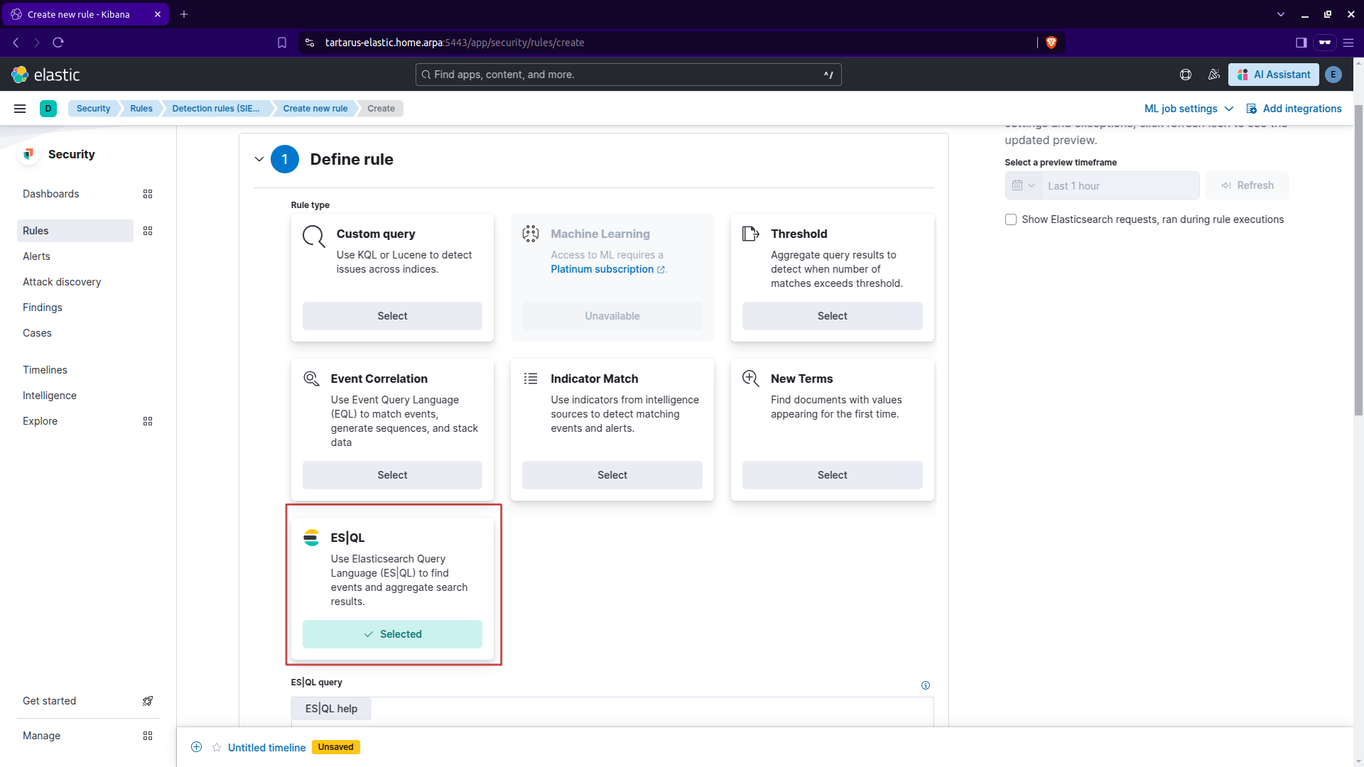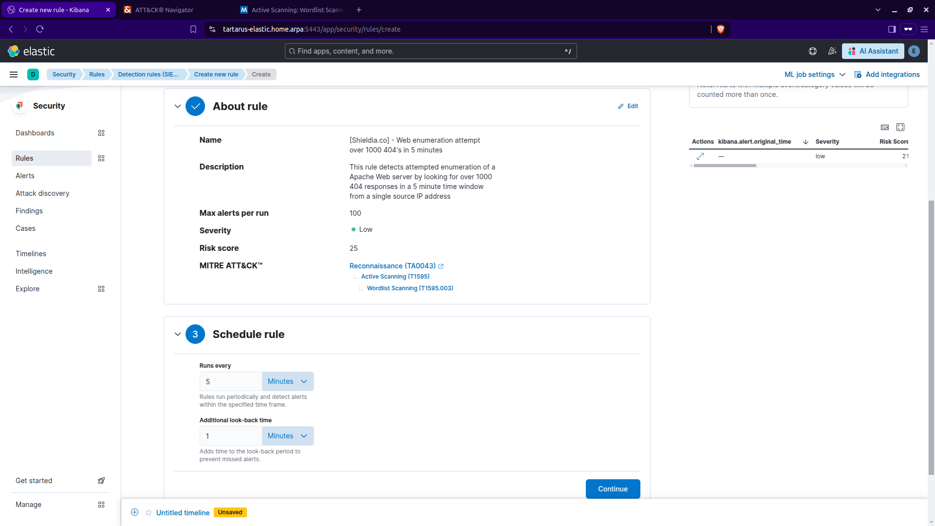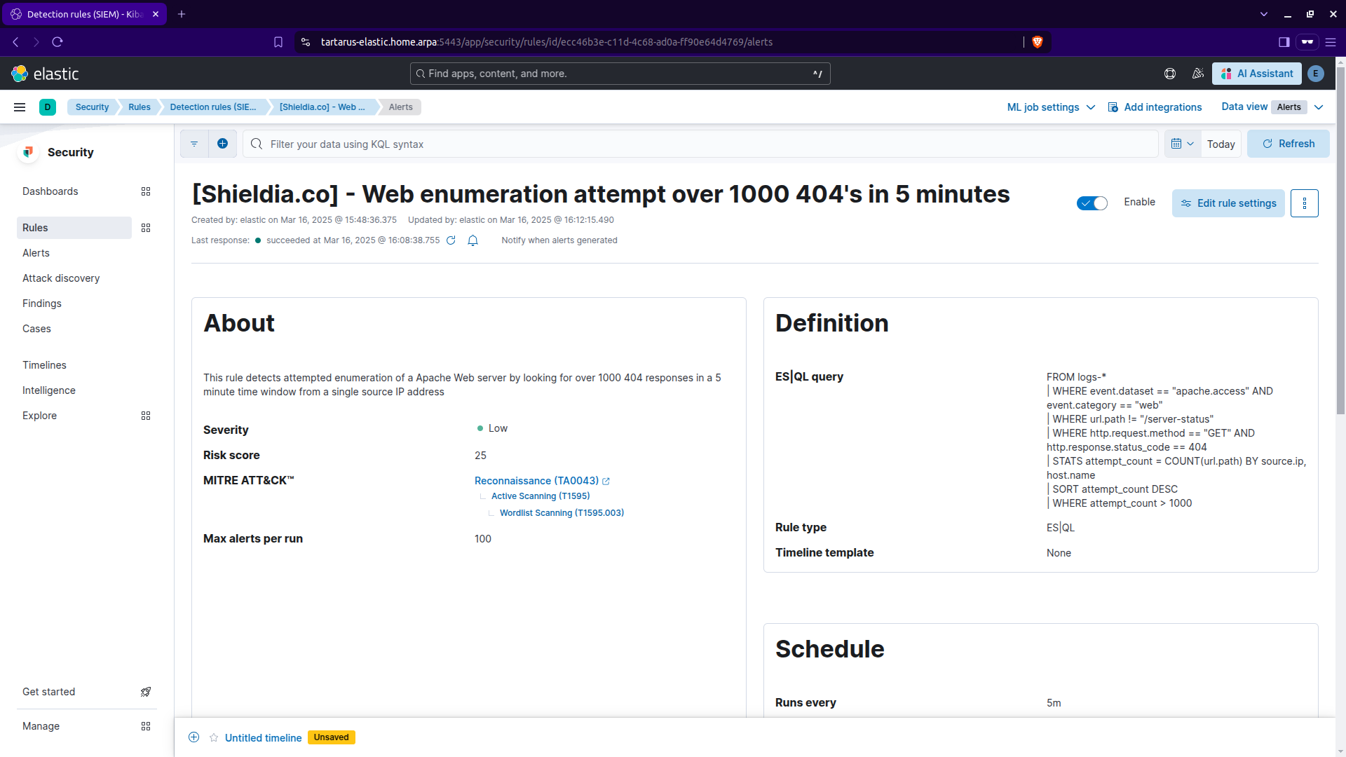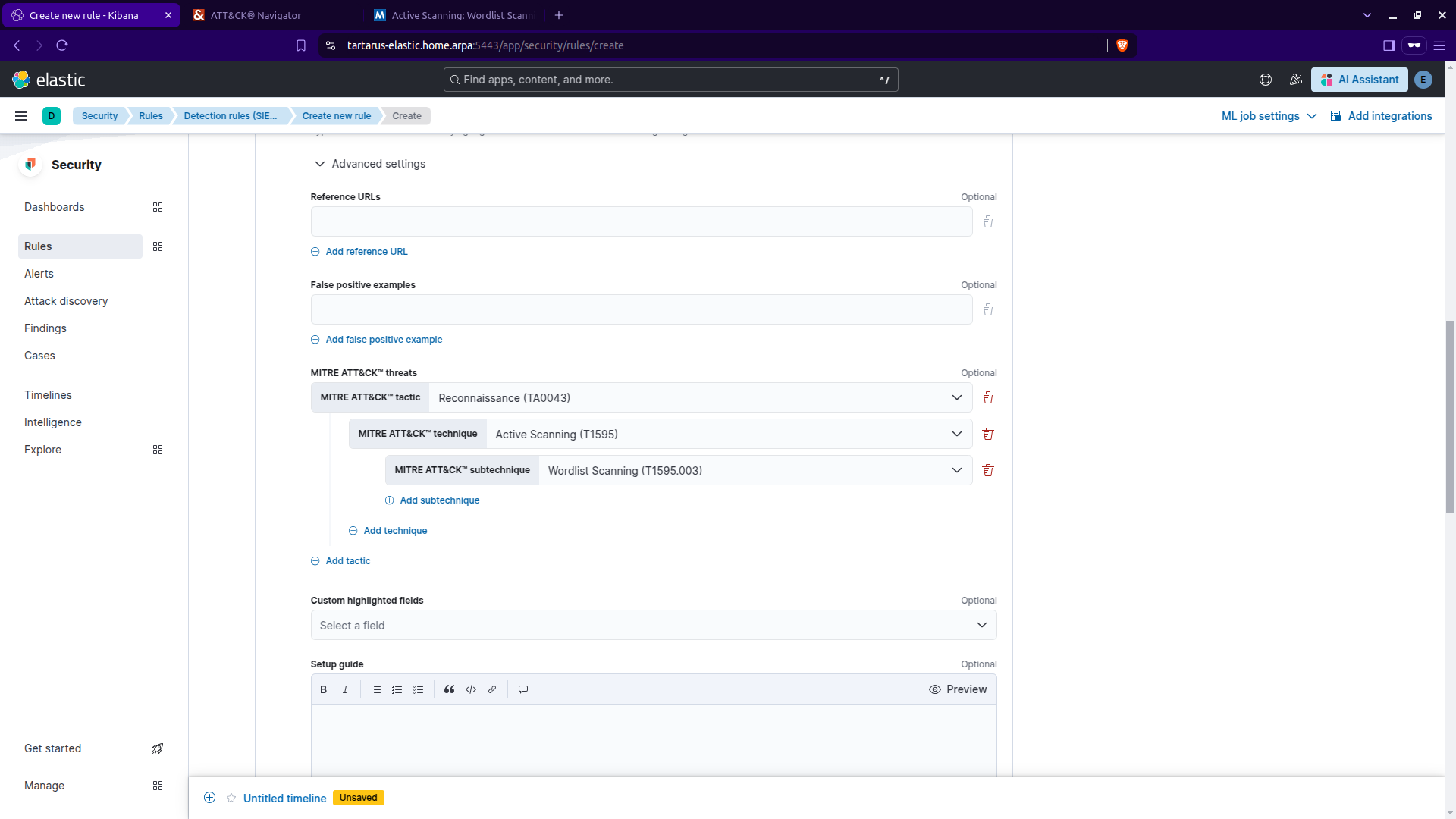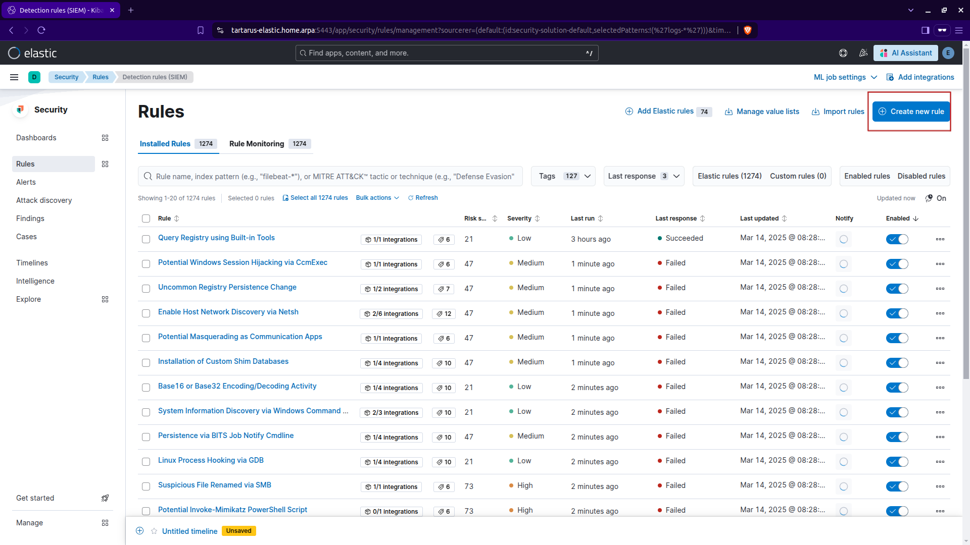 And wait for alerts to flow in, navigate to the ‘Alerts’ tab https://tartarus-elastic.home.arpa:5443/app/security/alerts