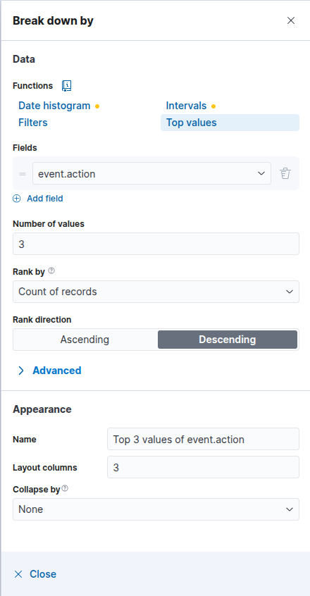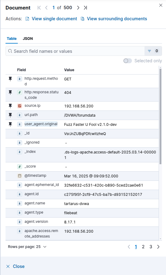 Now we can have a dig into what fields are recorded, the primary fields we are interested in are; http.request.method, http.response.status_code, source.ip, url.path and user_agent.original.