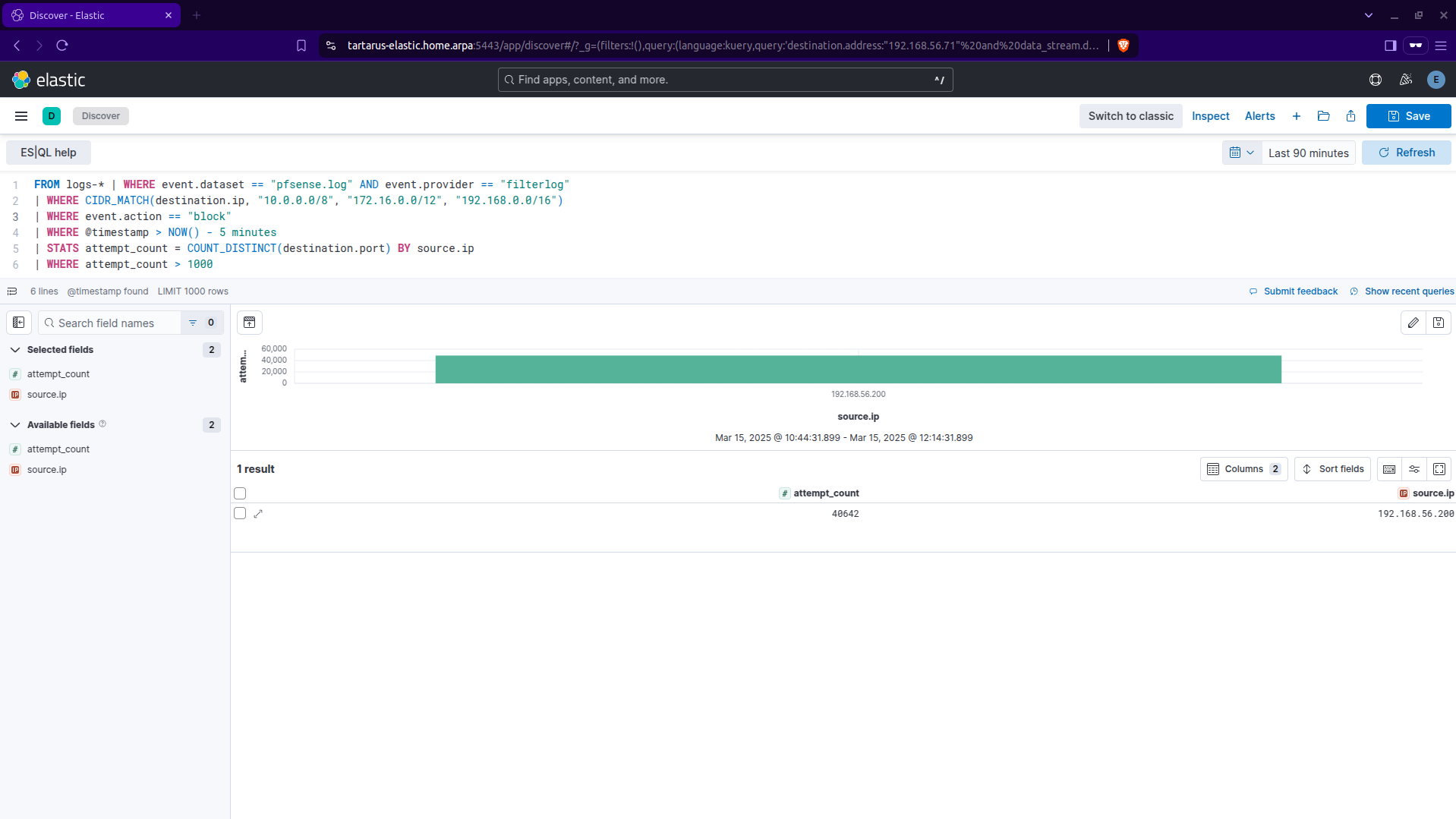 Something like this would capture what we want, to break it down we are looking for a single source IP address going to over 1000 unique ports of any device(s) within RFC 1918 address space over a 5 minute time window. I am aware in pord the WAN addresses wouldn’t be in 1918 address space. :)
