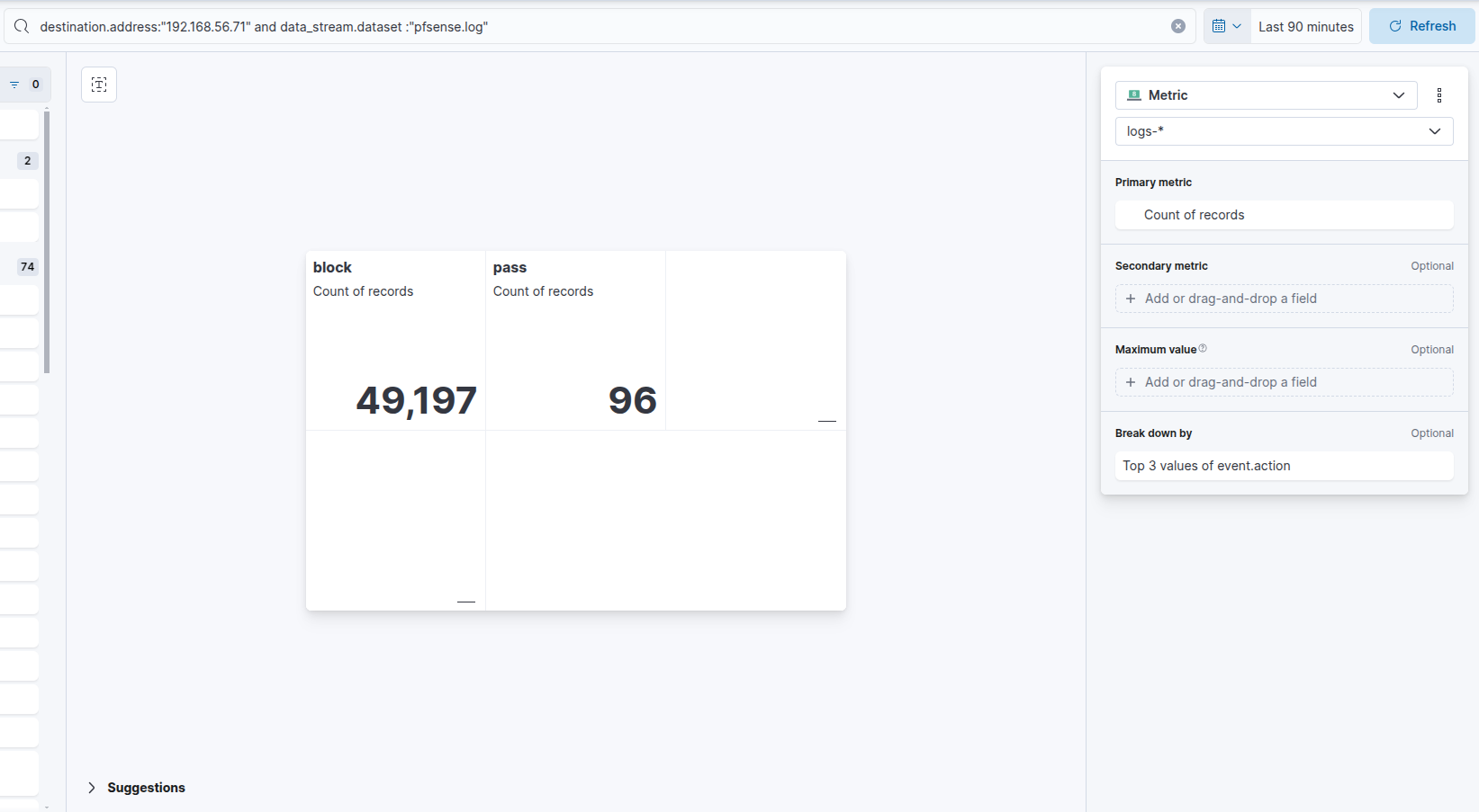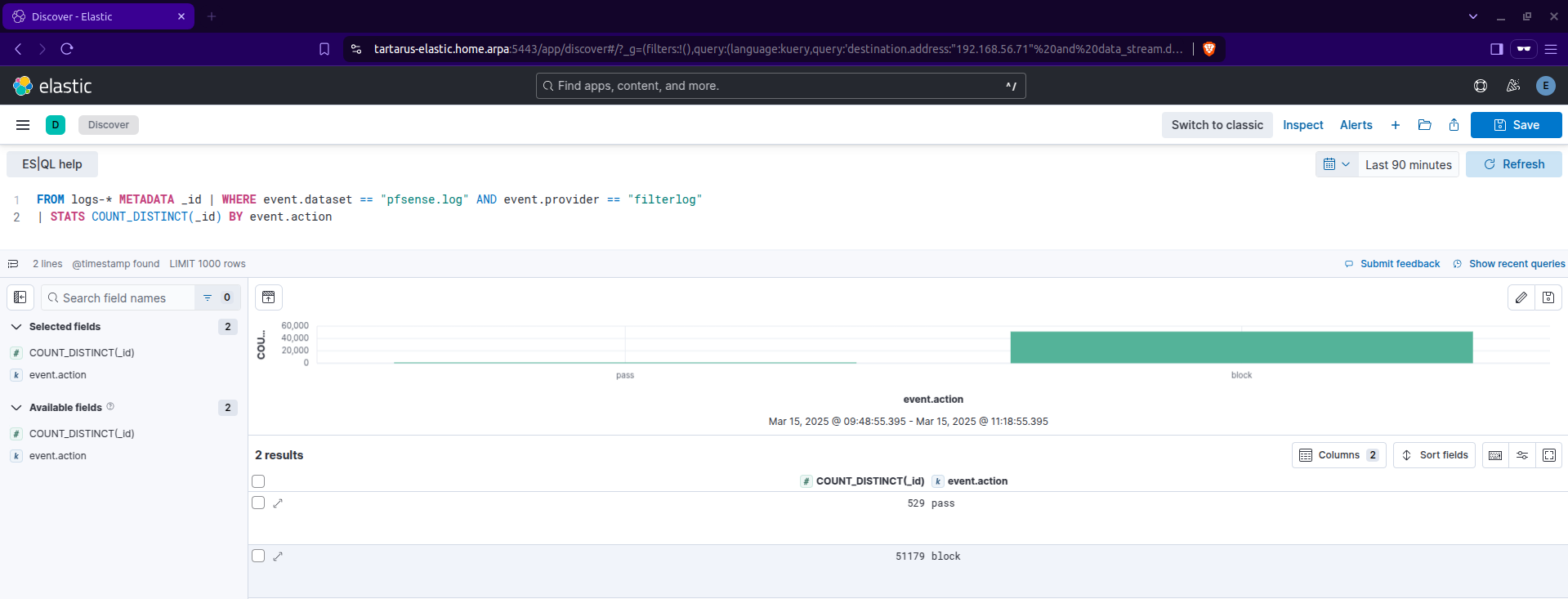 FROM logs-* | WHERE event.dataset == "pfsense.log" AND event.provider == "filterlog"