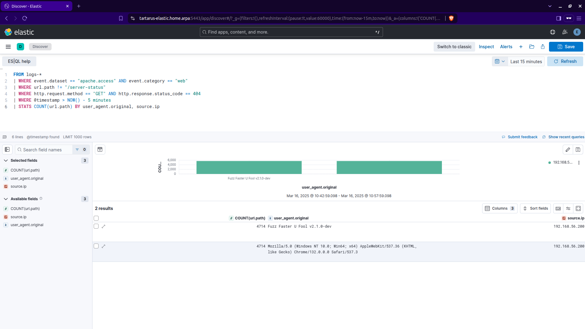 We have a few avenues to create detection logic, the most simple is look at that User-Agent, Fuzz Faster U Fool seems like quite the unique value. You can search for all logs with a User-Agent like this with:
