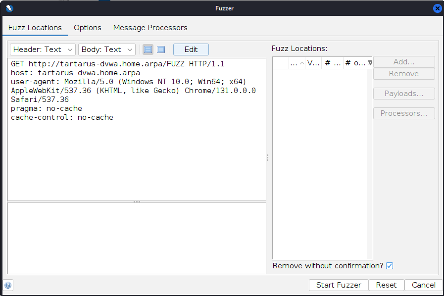 ffuf -H "User-Agent: Mozilla/5.0 (Windows NT 10.0; Win64; x64) AppleWebKit/537.36 (KHTML, like Gecko) Chrome/132.0.0.0 Safari/537.3" -w /usr/share/wordlists/seclists/Discovery/Web-Content/common.txt -u http://tartarus-dvwa.home.arpa:80/DVWA/FUZZ -mc 200 -r