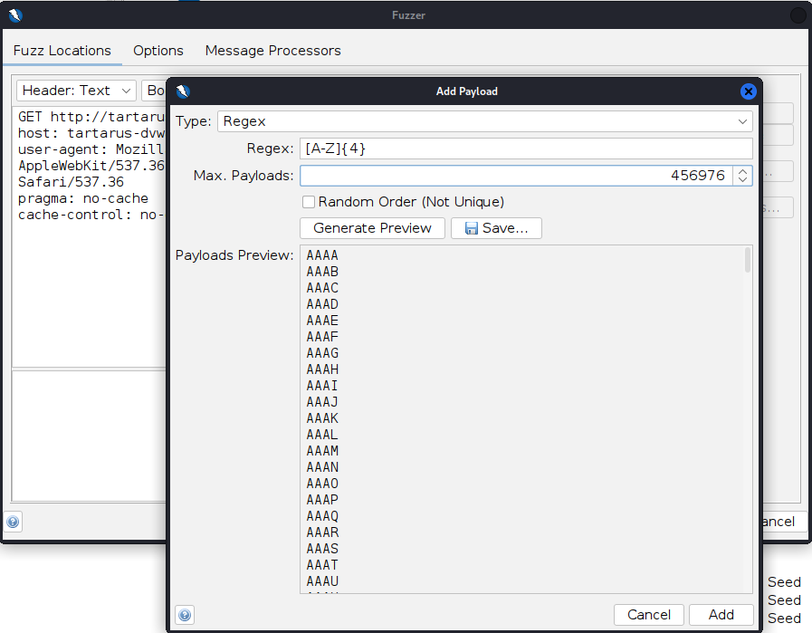 ffuf -u "http://tartarus-dvwa.home.arpa/FUZZ" -mc 200 -r -w <(pencode -input /usr/share/wordlists/seclists/Fuzzing/1-4_all_letters_a-z.txt upper)