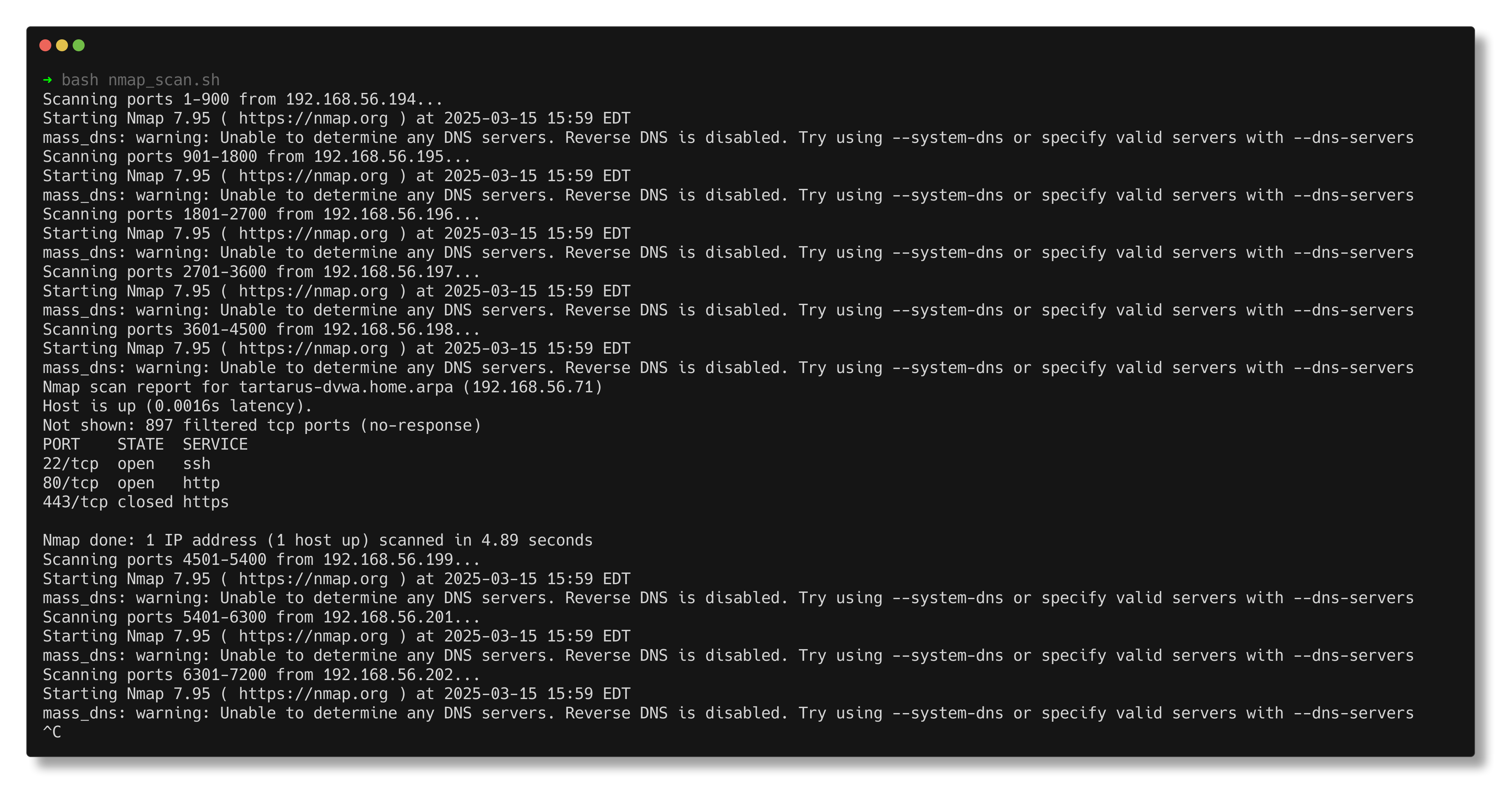 sudo nmap -Pn -vvv -sS --top-ports 100 tartarus-dvwa.home.arpa