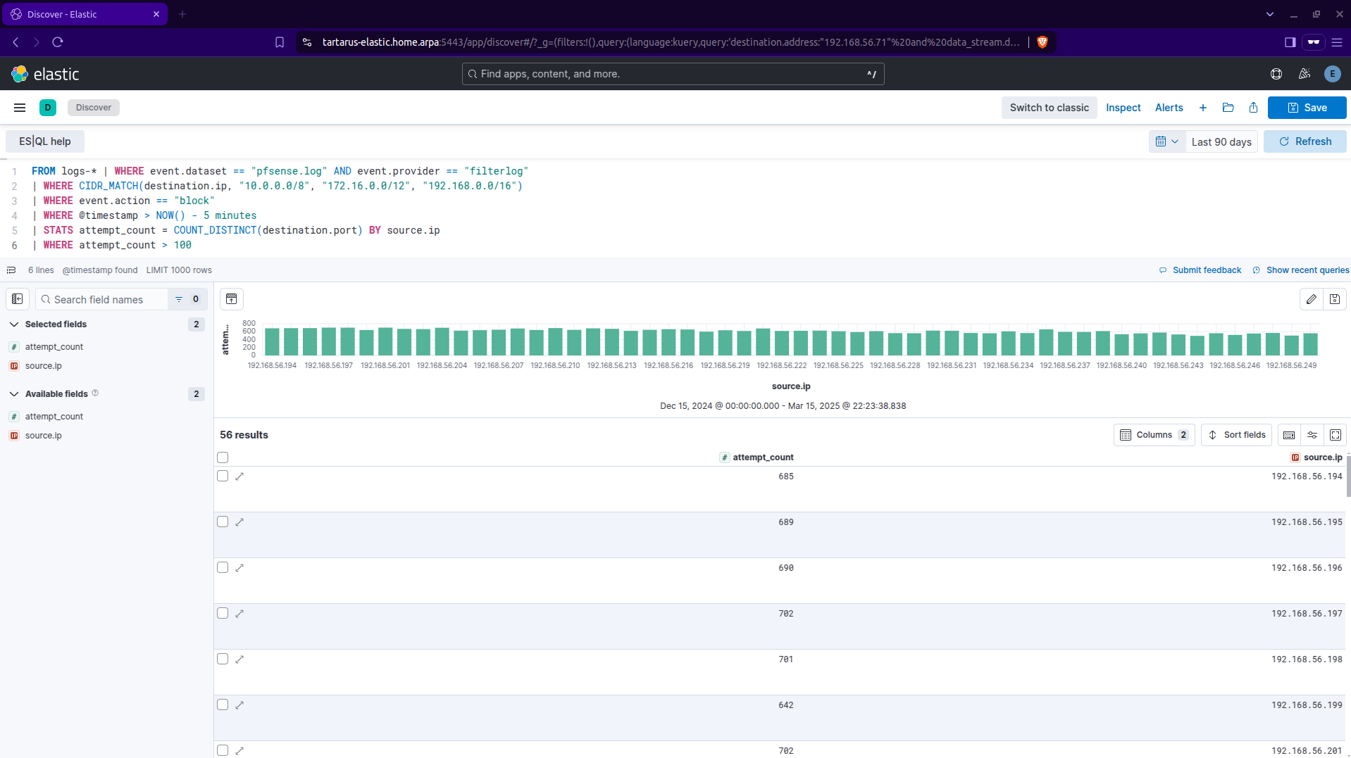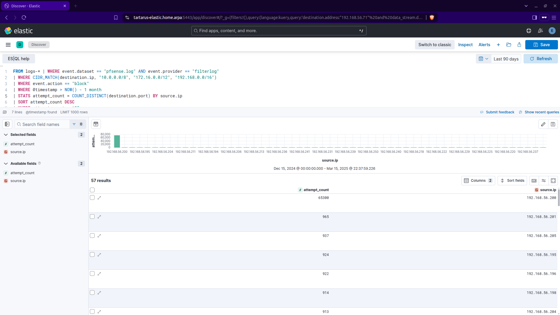And finally what if they have more than 1 IP address? For the sake of example I will use the namp -S flag with valid source IP addresses within the Tartarus Lab. Since the Hackers zone is a /26 and only 2 IP address are assigned (Kali and Firewall) we can inflate into the rest, then set the source IP address of a scan to each of the addresses and do a real sneaky beaky scan (importantly get the results!). This has the effect of limiting the total number of packets sent from each IP address, while maintaining the total number of packets sent.