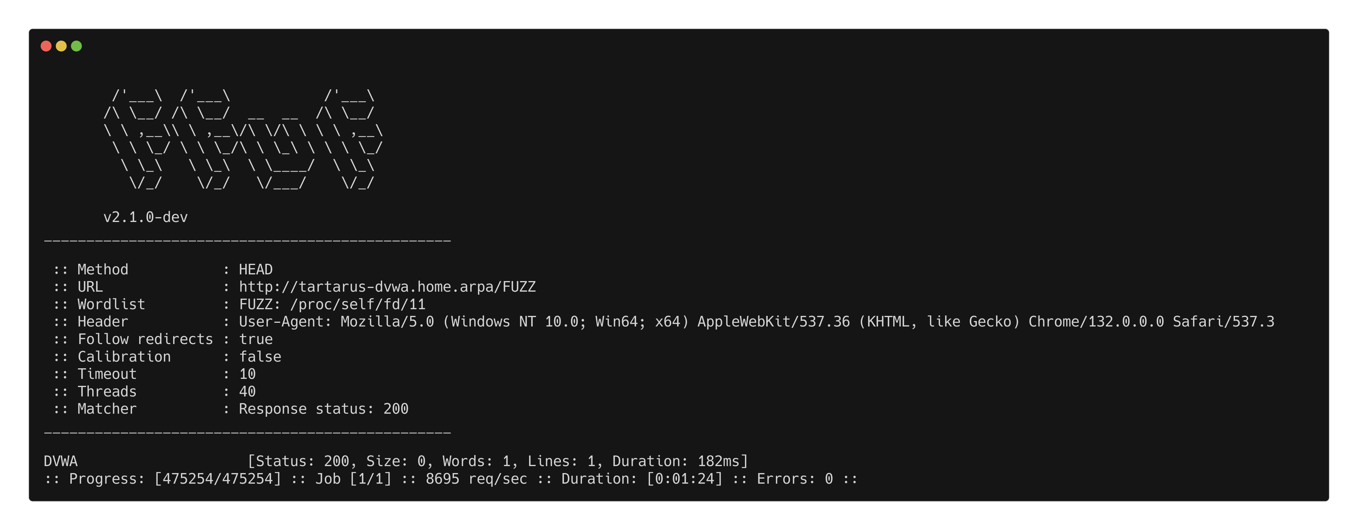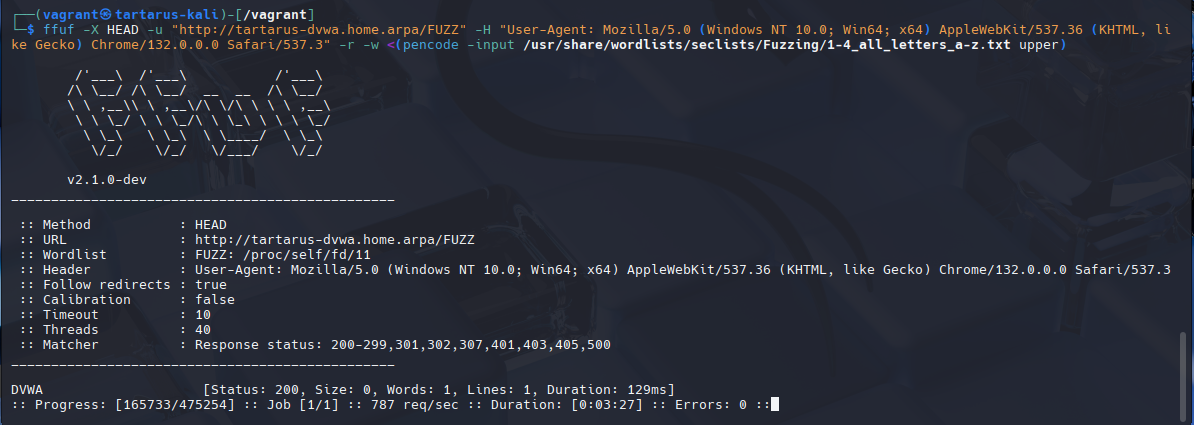 ffuf -X HEAD -u "http://tartarus-dvwa.home.arpa/FUZZ" -H "User-Agent: Mozilla/5.0 (Windows NT 10.0; Win64; x64) AppleWebKit/537.36 (KHTML, like Gecko) Chrome/132.0.0.0 Safari/537.3" -r -w <(pencode -input /usr/share/wordlists/seclists/Fuzzing/1-4_all_letters_a-z.txt upper)