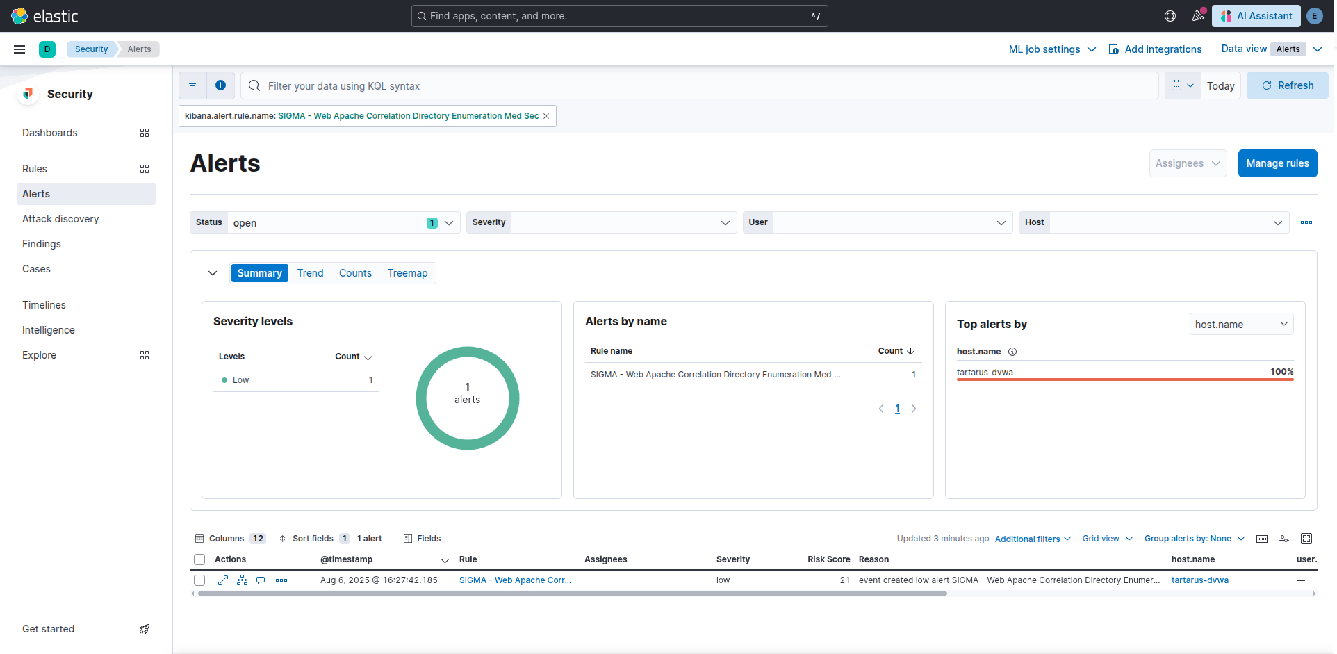 To catch this activity in the SIEM it’s as simple as changing the rule to remove the GET based filtering (The updated SIGMA rule is loaded automatically when the SIEM is provisioned as SIGMA - Web Apache Correlation Directory Enumeration Med Sec):
