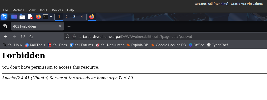 On the Kali guest navigate to (once you’ve logged in and set the sec to low): http://tartarus-dvwa.home.arpa/DVWA/vulnerabilities/fi/?page=/etc/passwd