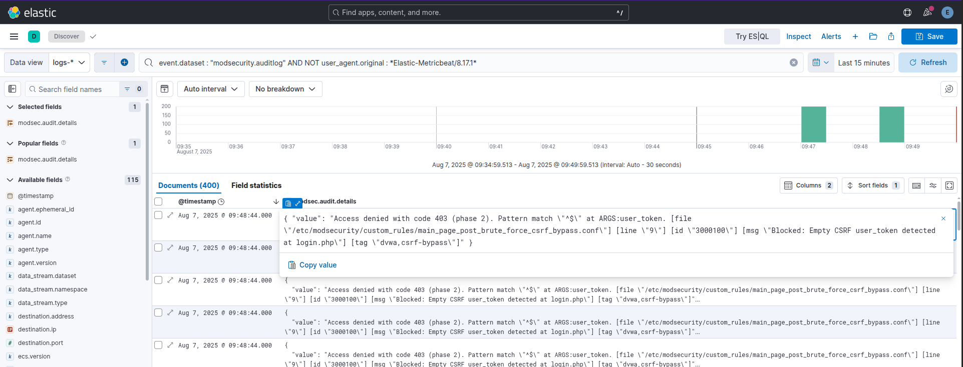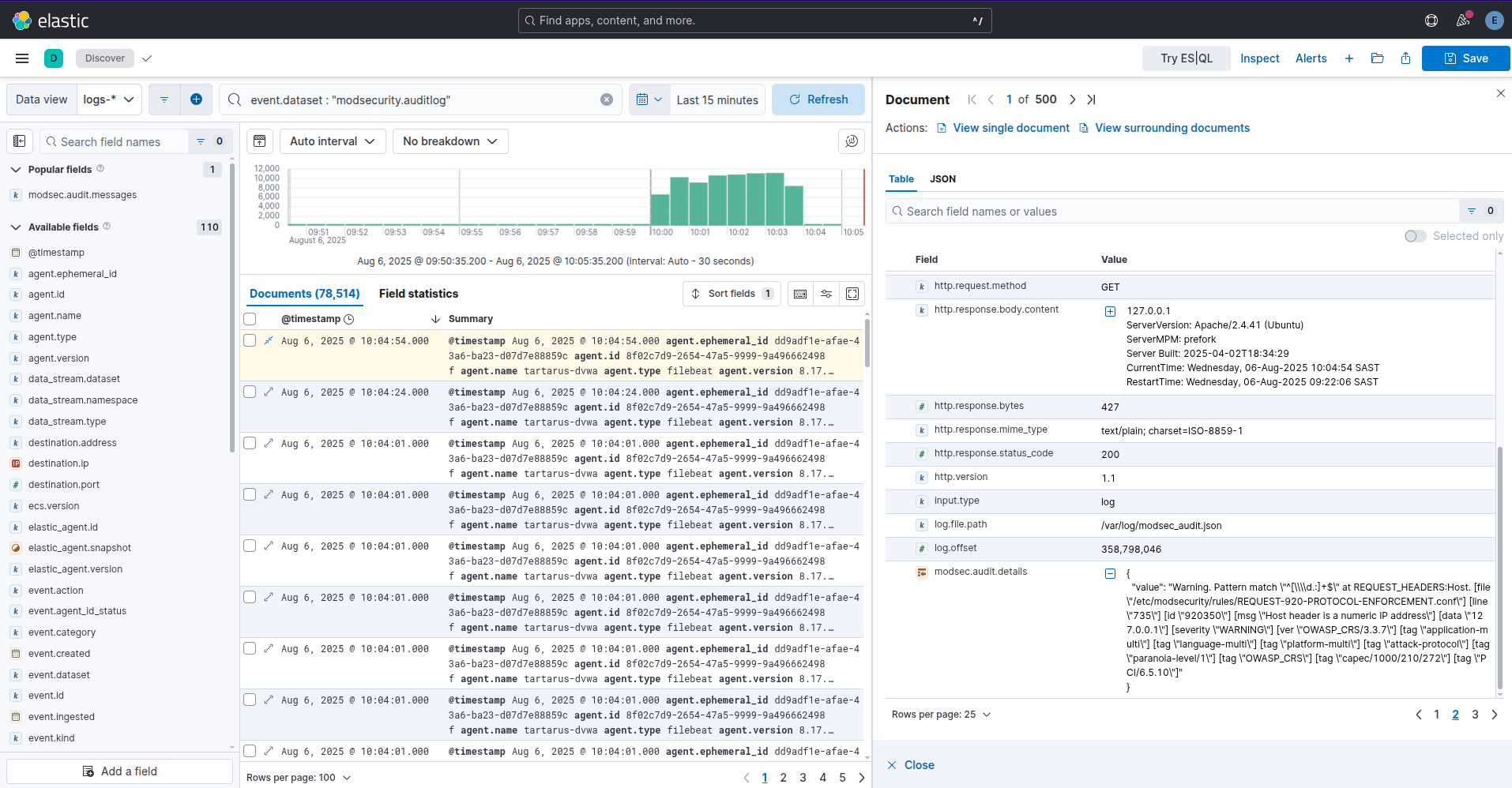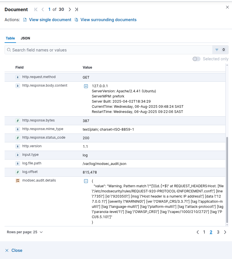 Under the “modsec.audit.details” key we see the reason, unfortunately it’s not fully parsed, it’s a weakness from the upstream Elastic parser hosted in GitHub.