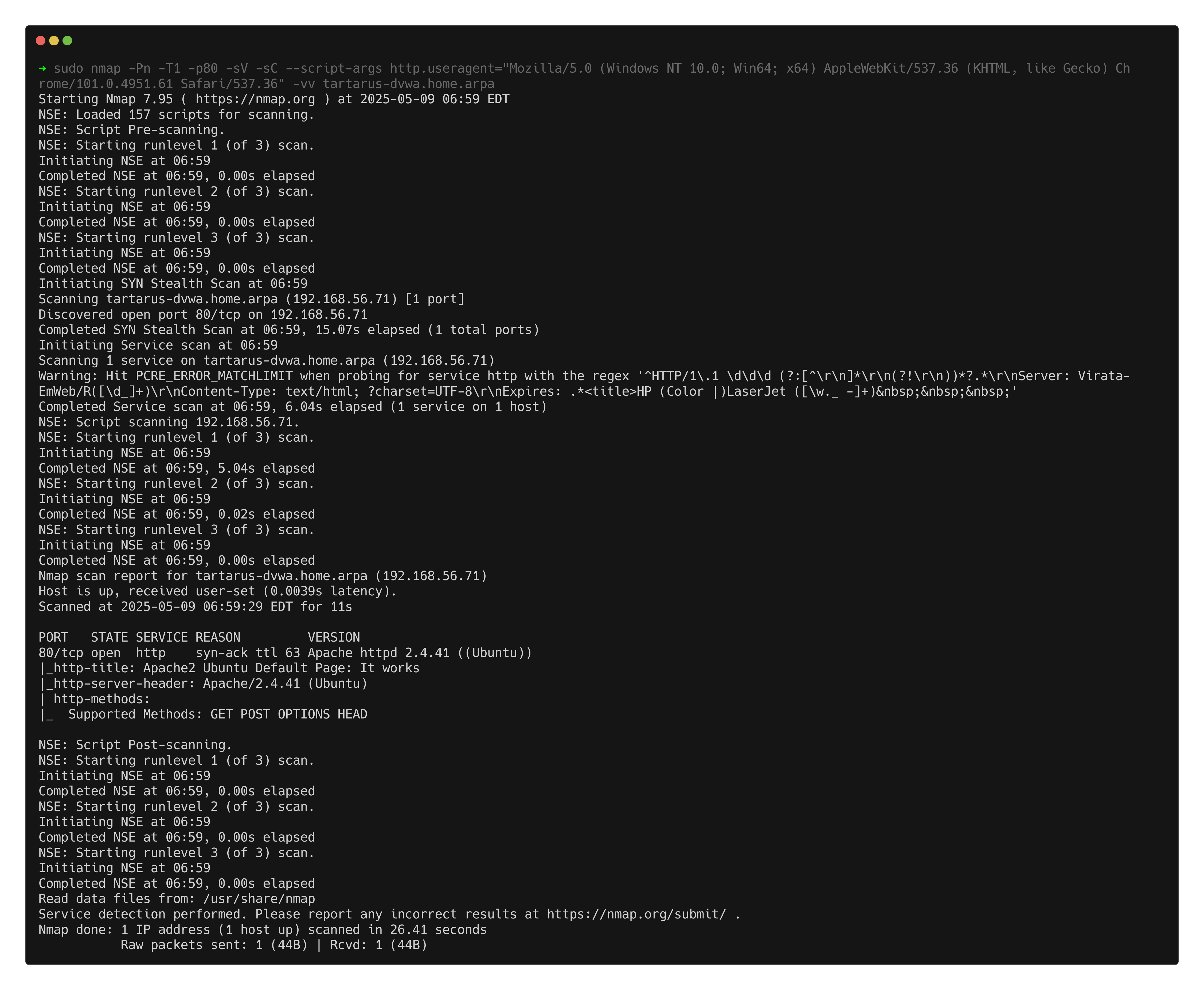 sudo nmap -A -Pn -p 80 -vvv --script-args http.useragent="User-Agent: Mozilla/5.0 (Windows NT 10.0; Win64; x64) AppleWebKit/537.36 (KHTML, like Gecko) Chrome/132.0.0.0 Safari/537.3" tartarus-dvwa.home.arpa