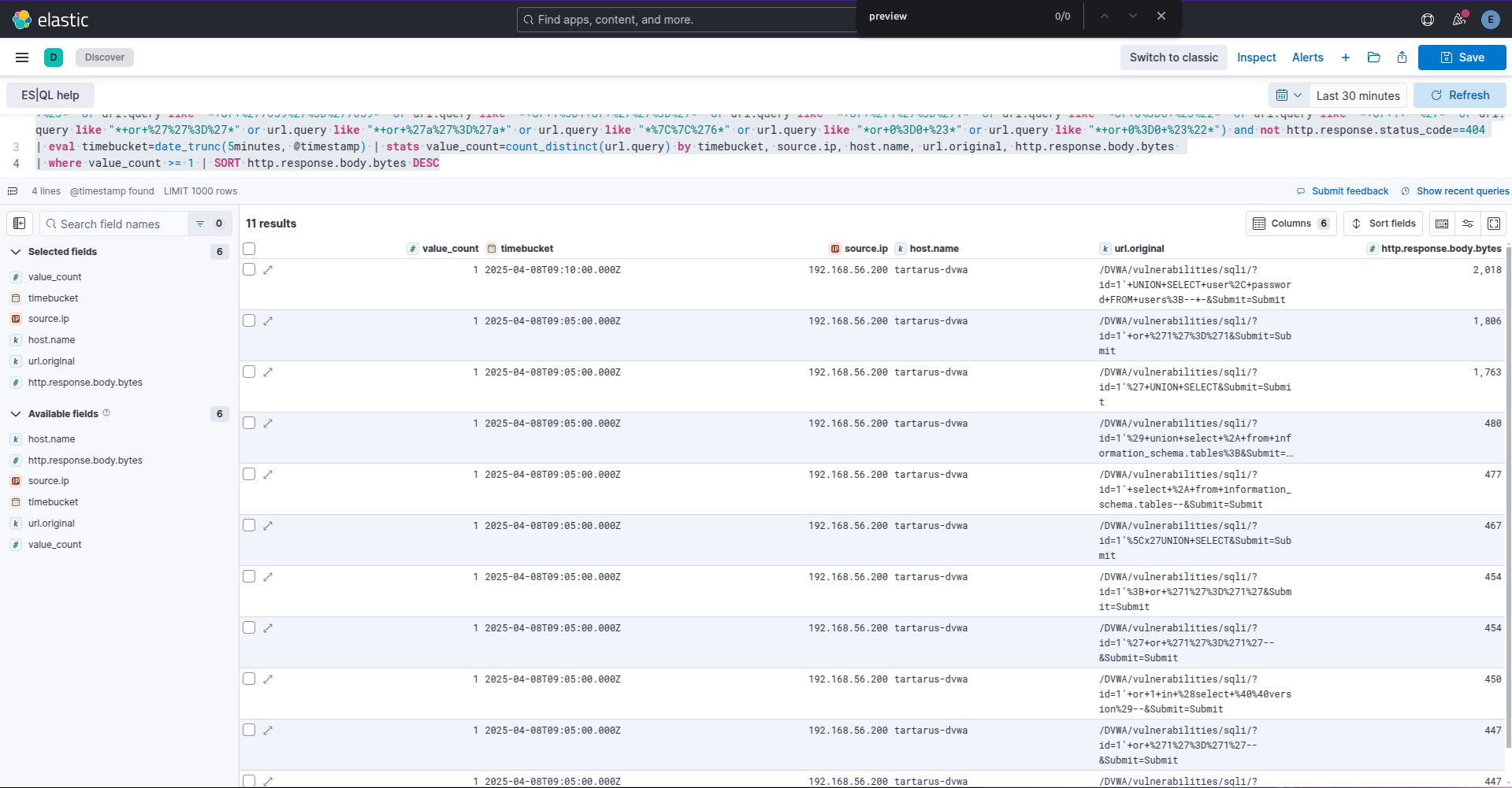 We have the same challenge as the discussed in the File Inclusion Challenge, how do we determine without the response body content what requests succeeded and which failed? Going back to basics, what information do we have? The response size would give us a clue. Running the following ES|QL search (It’s almost the same search the rule runs, or should run we won’t get into preview rule runs here):