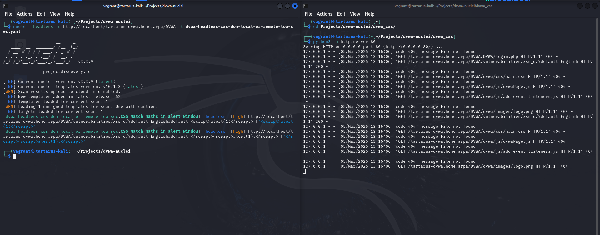 nuclei -headless -u http://localhost/tartarus-dvwa.home.arpa/DVWA -t /vagrant/nuclei-templates/dvwa/dvwa-headless-xss-dom-local-or-remote-low-sec.yaml