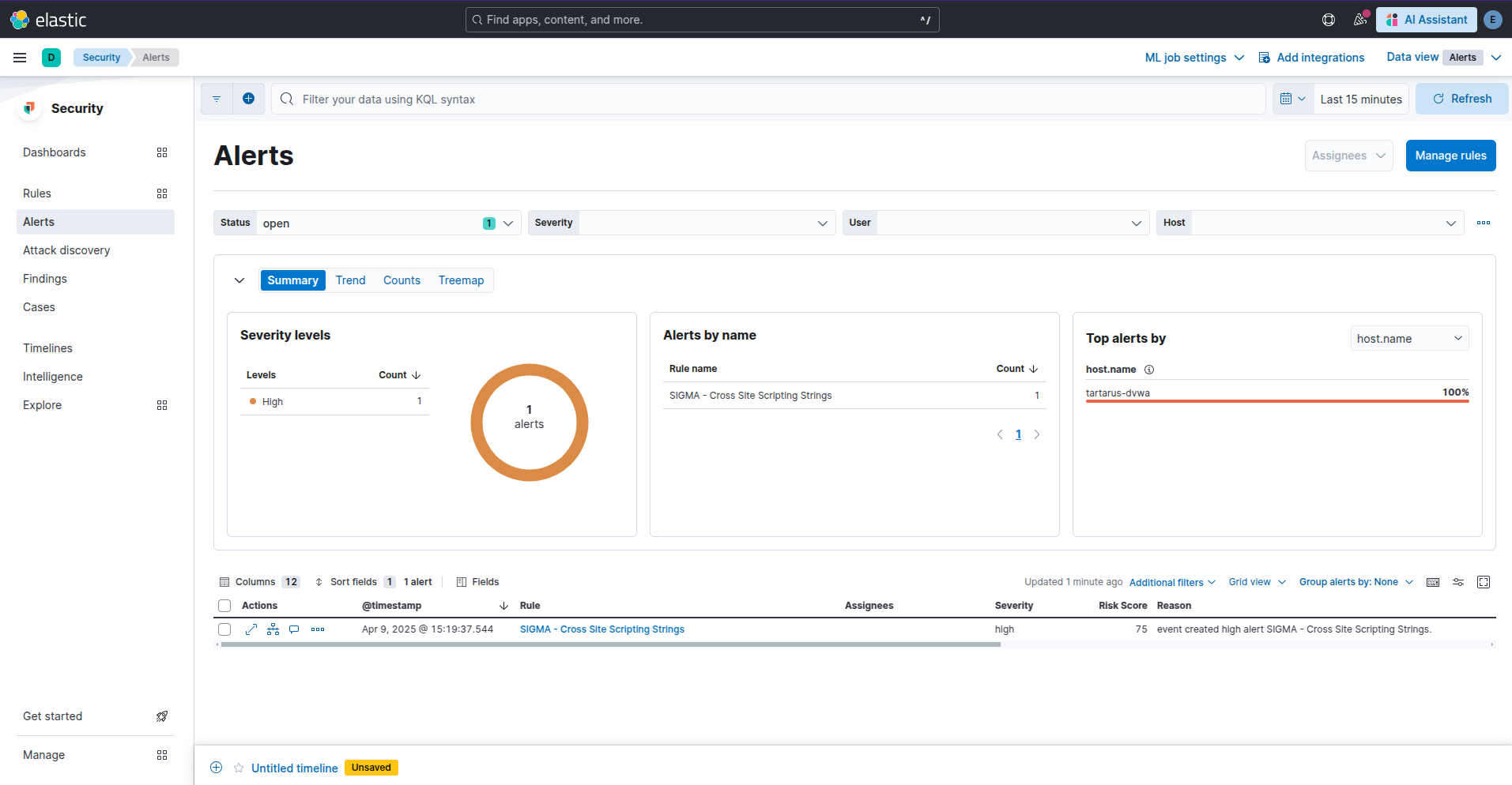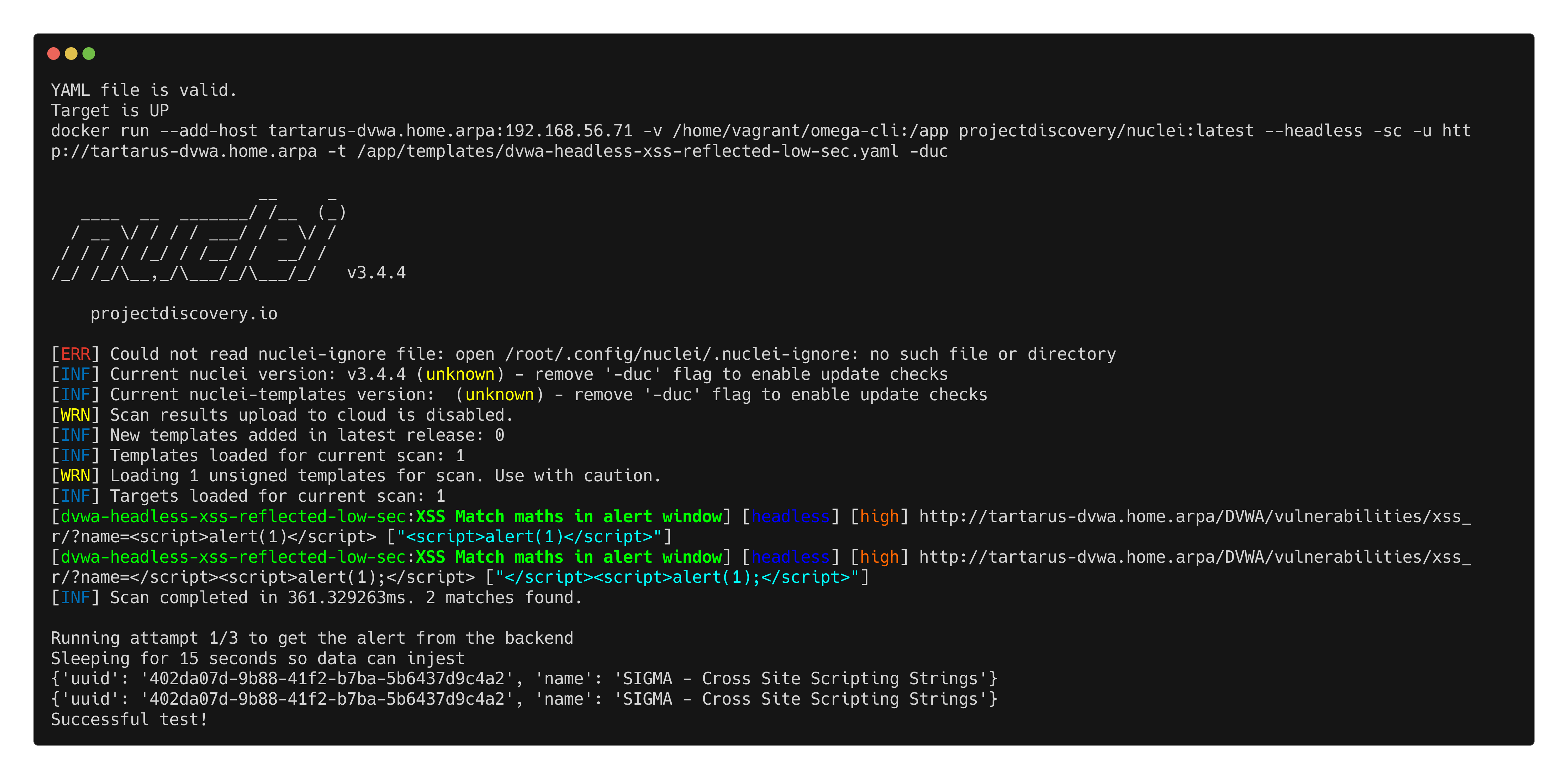 python3 omega.py --config tests/nuclei_headless_apache_reflected_xss.yml elastic-local -t http://tartarus-dvwa.home.arpa -d