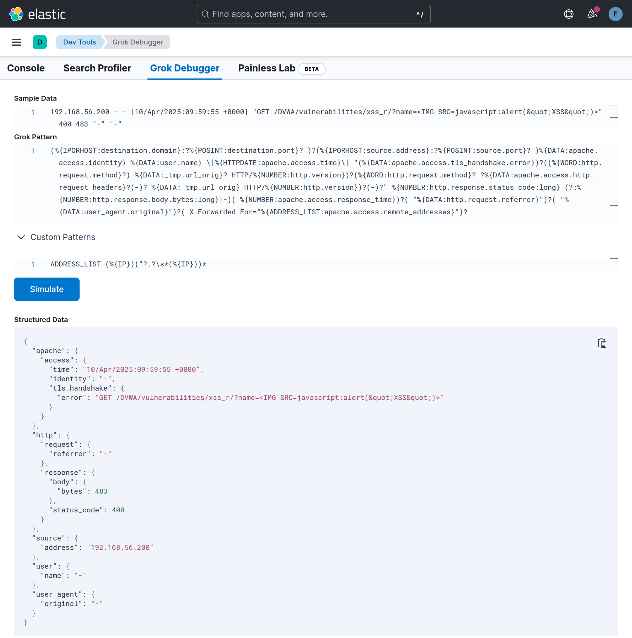 This sends raw requests to the server, each line in XSS-Fuzzing is sent exactly as is to the server. What about if it contains URL unsafe characters? Well they get sent as well! This breaks the grok pattern responsible for extracting all the values from Apache access.log.